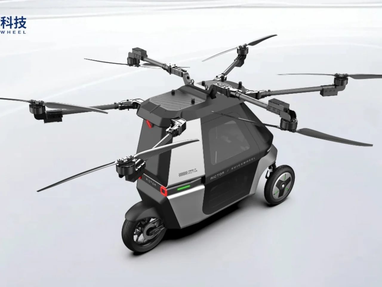 Kuickwheel Skyrider X6 - это летающий трицикл с нетипичным расположением колес: два сзади, одно впереди. Такой формат обеспечивает баланс между устойчивостью на дороге и маневренностью в полете. Корпус изготовлен из углеродного волокна и алюминиевых сплавов - легкий, прочный и как будто из ангара SpaceX.