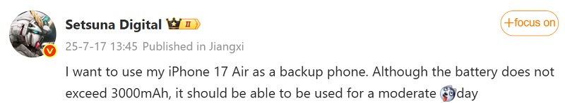 Инсайдер Instant Digital сообщил, что емкость батареи iPhone 17 Air “не превышает 3000 мАч”.