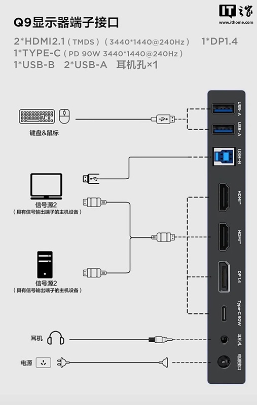 Thunderbird Q9 предлагает широкий выбор портов, включая HDMI 2.1, DisplayPort 1.4, USB-C с поддержкой зарядки до 90 Вт, а также USB-хаб и аудиоразъем. Встроенный KVM-переключатель позволяет управлять двумя устройствами с одной клавиатуры и мыши, а эргономичная подставка обеспечивает гибкую настройку положения экрана.