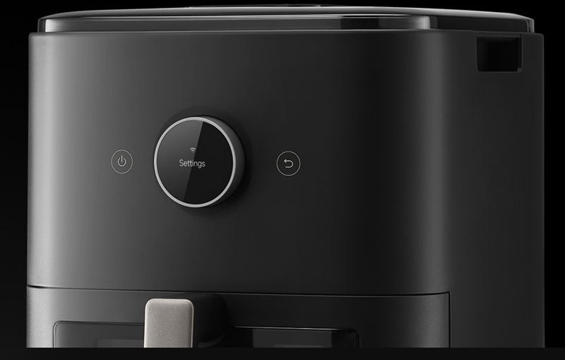 Устройство сохранило фирменный минимализм Xiaomi. На передней панели аэрогриля расположено широкое панорамное 7” окно, которое позволяет следить за степенью прожарки, не выдвигая чашу и не теряя тепло, а с помощью небольшого круглого LCD-дисплея можно выставить необходимые показатели.