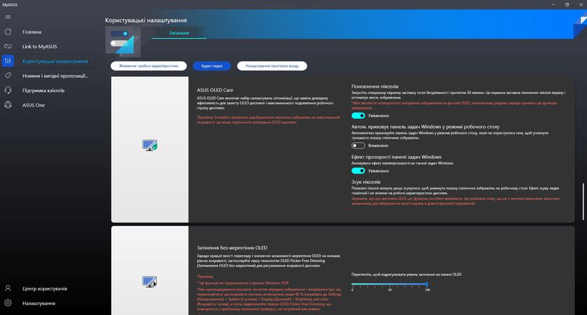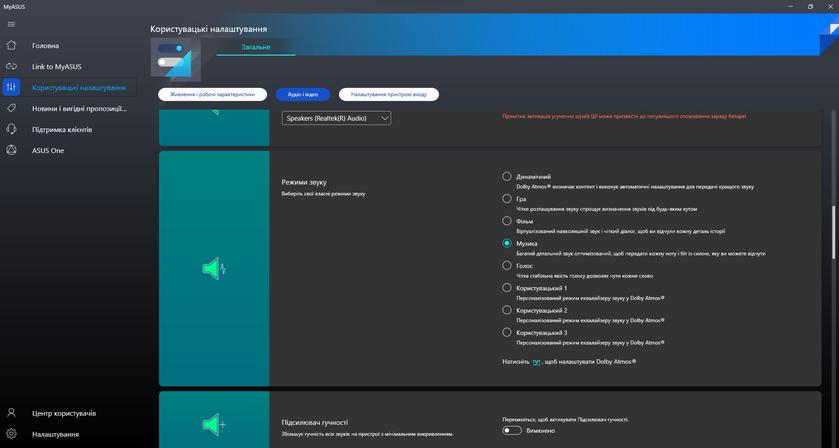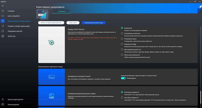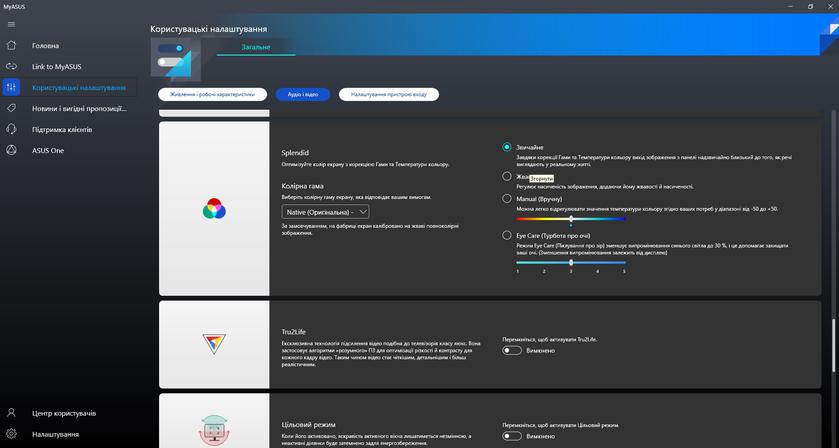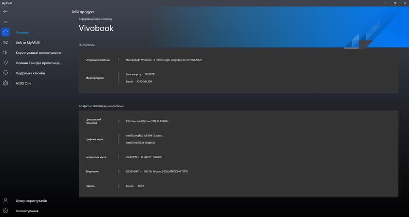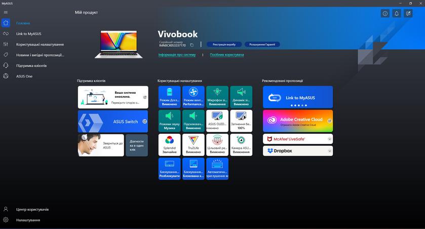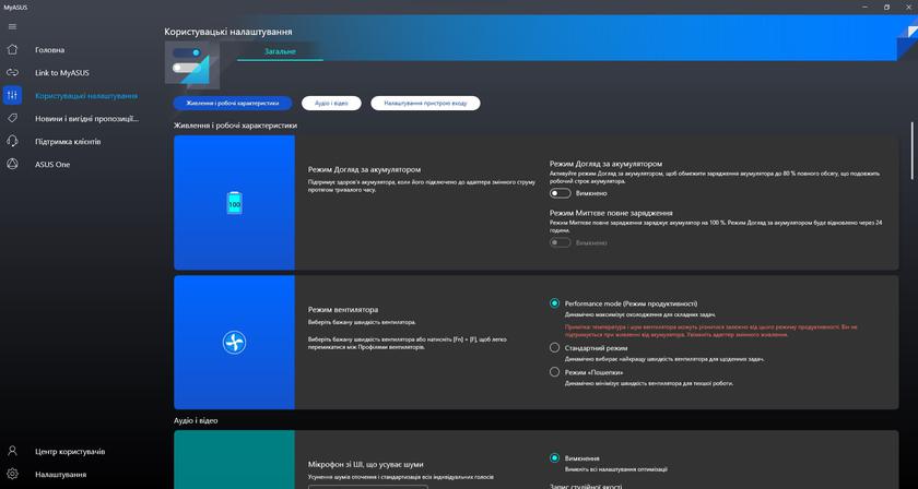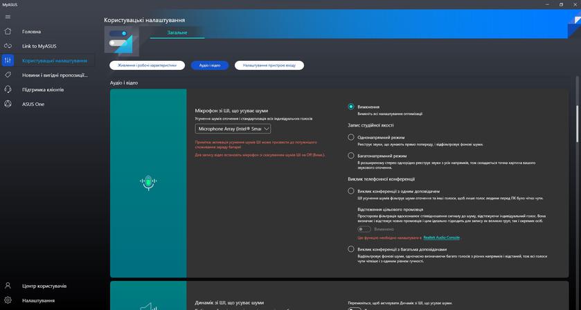 Из предустановленного программного обеспечения в ноутбуке есть привычное приложение MyASUS. Оно отвечает за все основные настройки (включая производительность, экран, шумоподавление и т.д.), диагностику и обновление системы.
