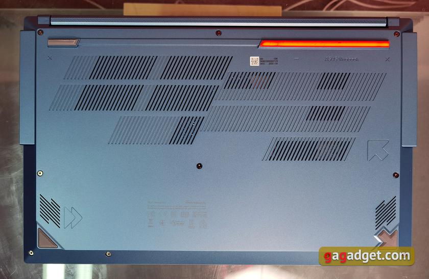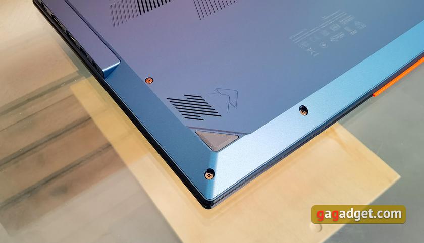 По углам нижней крышки расположились четыре резиновые ножки разной формы для хорошей фиксации ноутбука на столе. Есть много вентиляционных отверстий, а также стереодинамики, направленные вниз. Крышка закреплена десятью винтами Torx. Ее без проблем можно снять, но заменить возможно лишь накопитель и сетевой адаптер. Разъемов для дополнительного накопителя или оперативной памяти не предусмотрено. Хотя корпус не самый компактный и место можно было бы найти