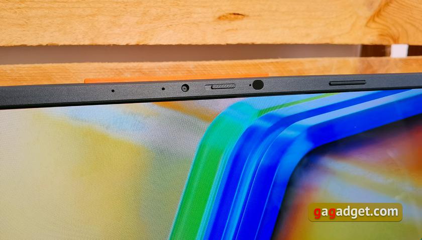 По периметру дисплейного блока имеются резиновые вставки. Над экраном - веб-камера с разрешением FullHD, имеющая механическую шторку. Она поддерживает технологию трехмерного устранения шумов ASUS 3D Noise Reduction (3DNR) в реальном времени, размытие фона и коррекцию яркости. Кроме этого, рядом два микрофона, индикатор работы камеры, а также сенсор освещенности для автоматической регулировки яркости.