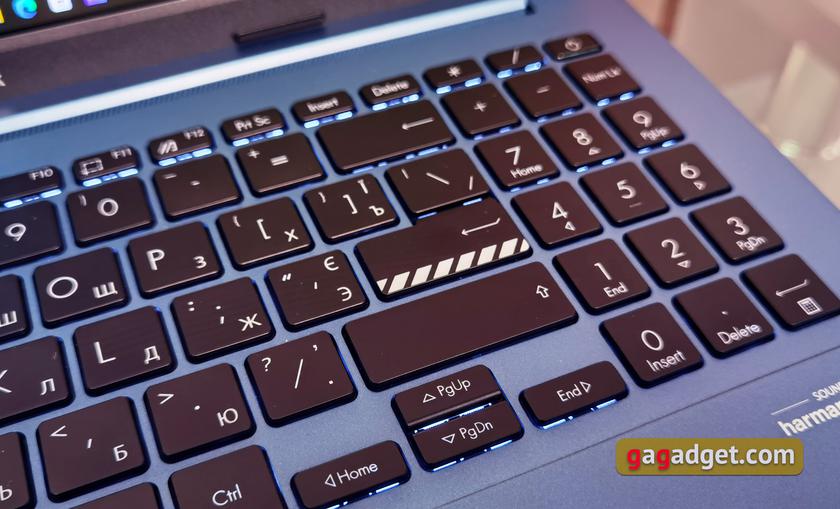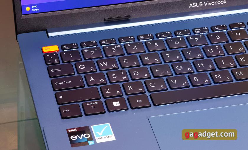 Клавиатура ErgoSense имеет интервал между клавишами 19.05 мм. Они имеют немного вогнутую на 0.2 мм форму и полный ход 1.4 мм. Пользоваться вполне удобно. Есть белая подсветка с тремя степенями яркости. Кроме оранжевой кнопки Esc, диагональными белыми полосками обозначена клавиша Enter, что также характерно для линейки Vivobook.