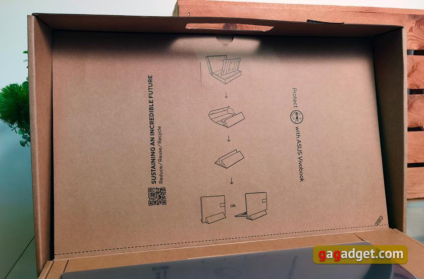 ASUS Vivobook S 15 OLED упакован в обычную коробку из картона горчичного цвета с названием модели и основной информацией. Внутри - ноутбук, блок питания мощностью 90 Вт, силовой кабель, документация и набор стикеров. ASUS часто предлагает использовать часть упаковки в качестве подставки. Так и в данном случае: внутренняя часть коробки имеет соответствующую перфорацию. Ее можно отрезать и сложить подставку, которая пригодится и для использования, и для хранения ноутбука в вертикальном положении: