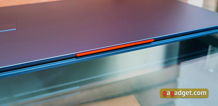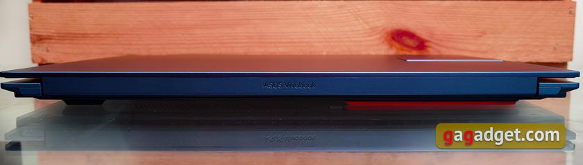 Вместо привычного выреза для открытия ноутбука, в ASUS Vivobook S 15 OLED предусмотрен выступ на верхней крышке ярко-оранжевого цвета.