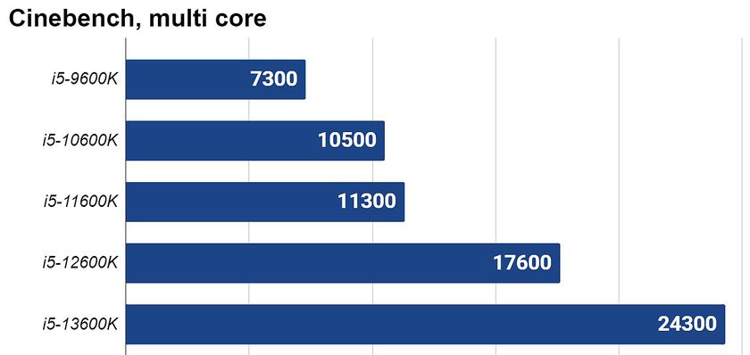 Серия Core i5 пополнилась как минимум двумя знаковыми процами. Так, 13400F обзавелся шестью мощных ядер и четырьмя энергоэффективными, тогда как у прошлогоднего 12400F дополнительных ядер не было вообще. А конфигурация ядер 13600K составила 6 P-cores + 8 E-cores, что дает суммарно 20 потоков. Столько же было у дорогостоящего Core i7-12700K, только в другой конфигурации: 8P + 4E. Оптимизированный техпроцесс Intel Fab 7 позволил повысить частоту ядер 13600K на 200 МГц и при этом наоборот снизить напряжение питания на 50 милливольт. Именно поэтому новый i5 быстрее и холоднее старого i7.
