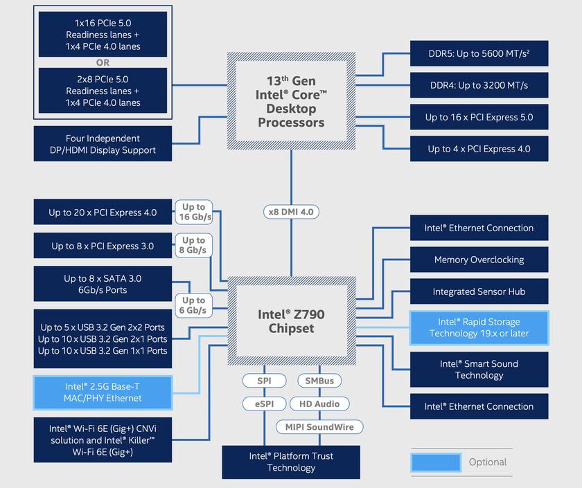 Кеш L2 удвоился как для старших, так и для младших ядер. Ранее столь большим кешем могли похвастаться только серверные процы Xeon. Объем L3 кеша остался прежним, но теперь за выборку Prefetch отвечает искусственный интеллект. Какая информация важнее и остается в процессорном кеше, а какую можно безболезненно выгрузить в оперативную память. К слову, подросла и частота поддерживаемой ОЗУ: DDR5-5600 МГц с возможностью ручного оверклокинга до 7000+ МГц. Сохранилась обратная совместимость и с народно любимой DDR4.