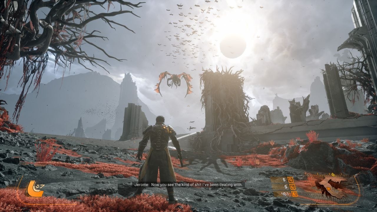 Интересное исследование биомов, большое разнообразие оружия (от автоматов до арбалетов), брутальные враги, сложные боссы и постоянный прогресс приводили к тому, что я играл до состояния, когда пальцы начинали болеть от нажатия на триггеры. Да, ты умираешь, но уже изучил атаки босса, знаешь, какое оружие подходит под него, и возвращаешься сильнее. Именно это чувство постоянного обучения дарит мотивацию и желание двигаться вперёд. Добавьте к этому вечный драйв на экране, шикарную реализацию фишек DualSense — и получаем игру с геймплеем, который не надоедает.