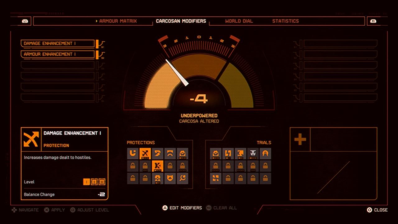 Авторы решили сделать так, чтобы как можно больше игроков смогли пройти игру. Для этого после убийства второго босса вам открывается доступ к модификаторам на базе. Они позволяют детально настраивать стиль игры, балансируя бонусы и штрафы в соответствии с индивидуальной тактикой. Можно увеличить урон врагам или сделать так, чтобы вы теряли меньше здоровья.