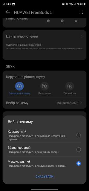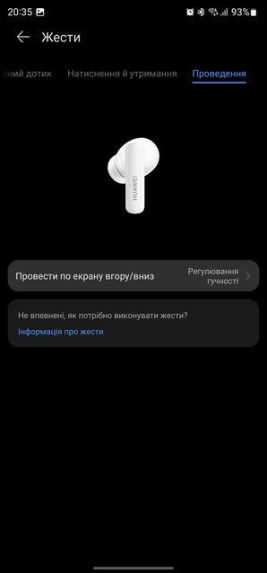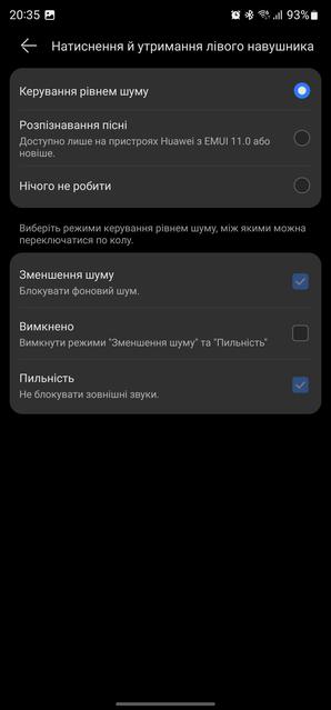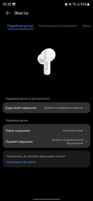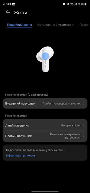 Для Huawei FreeBuds 5i наушниками предусмотрены сенсорные области на ножках наушников. Они небольшие, но за день-два можно привыкнуть и попадать с первого раза. По умолчанию схема такая. Двойное касание по правому наушнику отвечает за паузу и воспроизведение (или принятие/отклонение вызова), по левому наушнику - переключение на следующий трек. Длинное касание - переключение режима шумоподавления. Можно также выбрать два из трех режимов. Например, оставить только переключение между активным шумоподавлением и режимом прозрачности. На длинное касание можно переназначить функцию распознавания трека. Но она работает только со смартфонами Huawei и только на EMUI 11 или более новой версии. Проведение вверх-вниз отвечает за регулировку громкости.