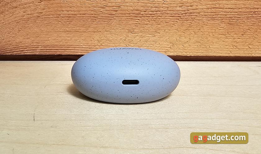 Зарядный кейс компактный, овальной плоской формы. Вес всего 33 г без наушников. Можно вполне комфортно носить в кармане, он почти не ощущается. В голубом варианте наушников кейс имеет приятную матовую текстуру и небольшие более темные вкрапления. Благодаря этому, он долго будет иметь опрятный вид. Спереди есть логотип Huawei и светодиодный индикатор зарядки или режима подключения. Сбоку - единственная кнопка, отвечающая за активацию режима подключения.