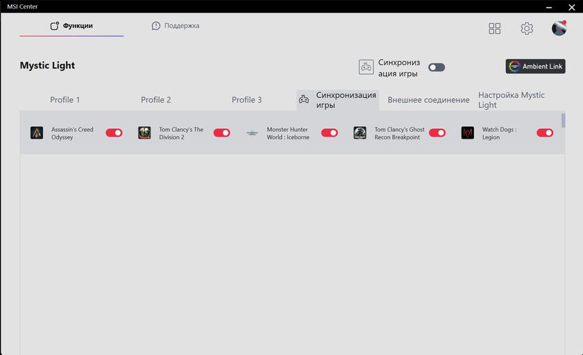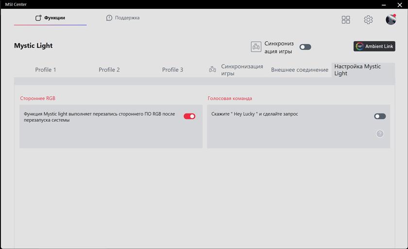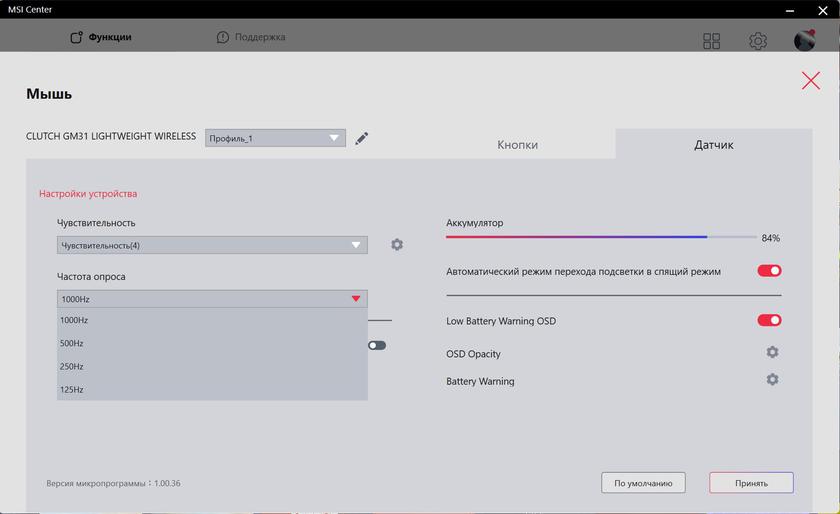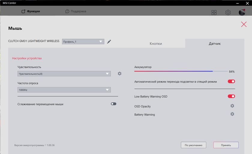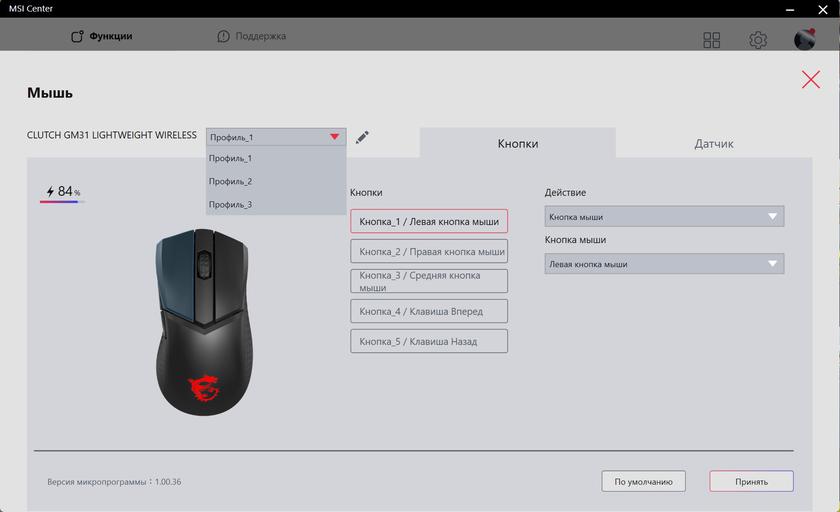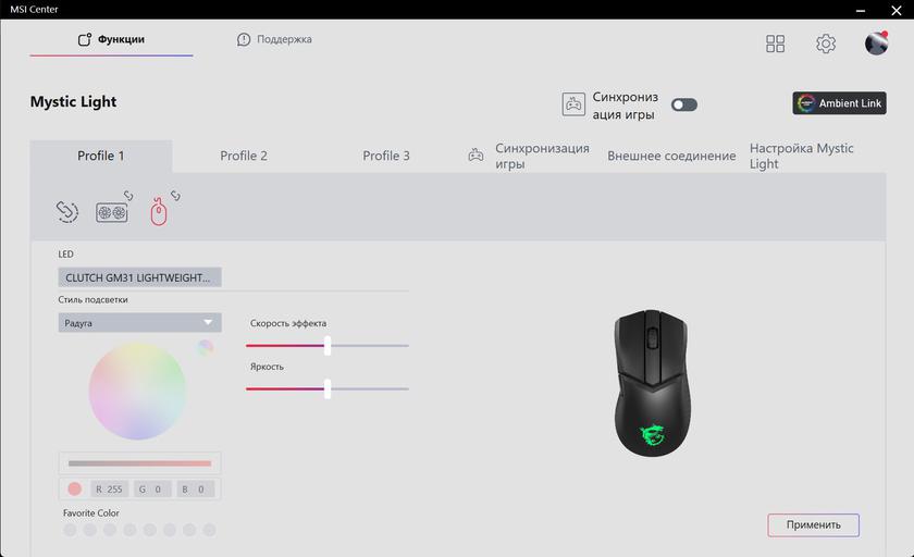 Для настройки используется общее приложение MSI Center, отвечающее за всю периферию и комплектующие MSI. Основные настройки выполняются во вкладке Gaming Gear. А именно: назначение кнопок, профили, уровни DPI, частота, сглаживание и настройки аккумулятора. Уровень заряда, автоматический переход в режим сна и индикация при низком заряде. К сожалению, время перехода в режим сна настроить нельзя, только стандартный вариант 2 минуты. Настройка подсветки вынесена в отдельный раздел Mystic Light. Есть стандартный набор из эффектов, их скорости и яркости. Также есть возможность синхронизировать подсветку с некоторыми играми (которые это поддерживают), железом и умными лампами. Mystic Light использует открытый код, поэтому поддерживается синхронизация и с устройствами сторонних производителей. В общем, в ПО есть все необходимое, но логика интерфейса не самая удобная.