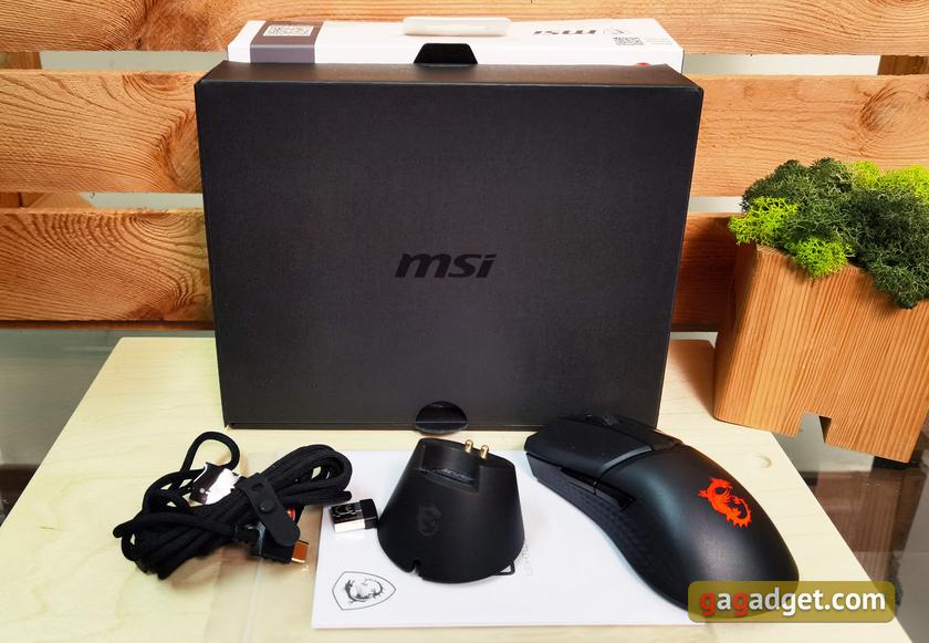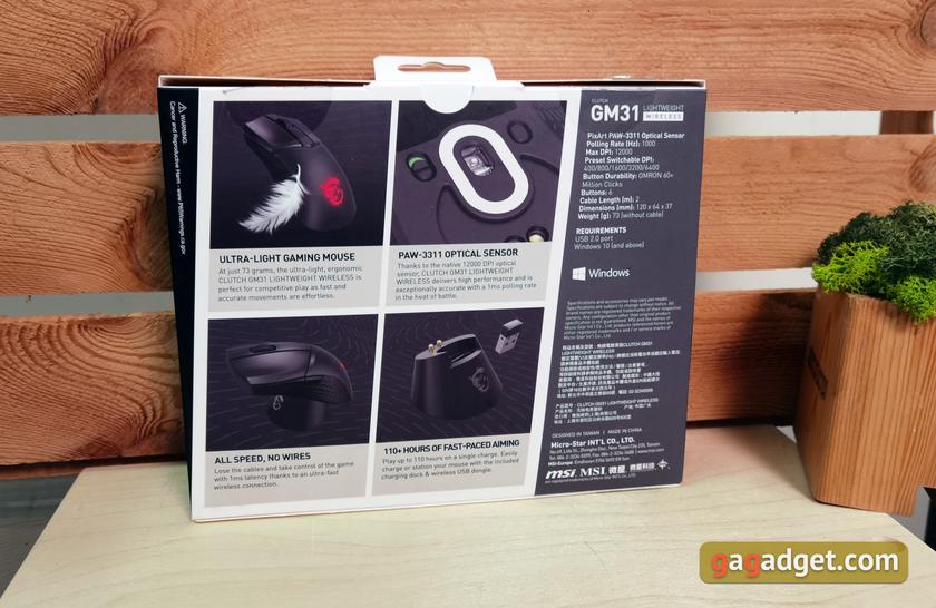MSI Clutch GM31 Lightweight Wireless упакована в достаточно большую коробку с черно-белой полиграфией, изображением мышки спереди и основными характеристиками сзади. В коробке - сама мышка, 2-метровый кабель с тканевой оплеткой, зарядная док-станция, USB-трансмиттер и документация.