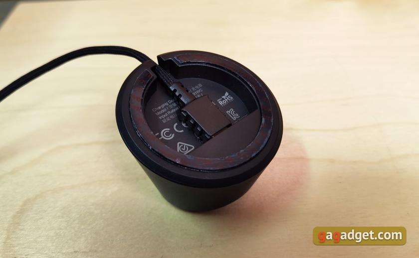 Зарядный док небольшого размера. Сверху - подпружиненные контакты для зарядки мышки и углубление с разъемом USB для подключения USB-трансмиттера. Снизу - порт Type-C для подключения кабеля.