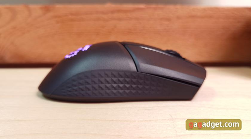 В целом, форма MSI Clutch GM31 Lightweight Wireless очень удобная. Конечно, все зависит от размера руки, но для хвата ладонью или пальцами мышка подходит прекрасно. Менее популярный хват когтем - не столь хорошо, но тоже вполне нормально. Возможно потребуется некоторое время на привыкание после более широких моделей. Мне после долгого использования Mionix Castor первые несколько дней мышка казалась узкой. Мышка очень легкая, а текстурированные боковины помогают ее надежно держать в руке. И, что важно, распределение веса правильное. Мышка не заваливается вперед или назад, если поднять ее над поверхностью.