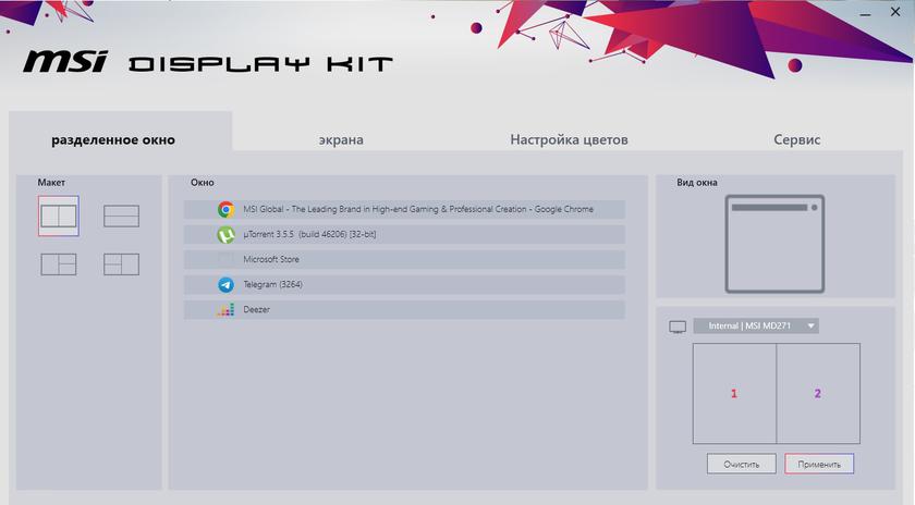 Дополнительно можно установить приложение MSI Display Kit, в котором можно настроить практически всё, начиная с многооконных режимов с пресетами по приложениям, гибкой настройки цветовой температуры и годовыми режимами для разных целей (включая игровые) и заканчивая всяческими бонусами типа виртуальной клавиатуры.