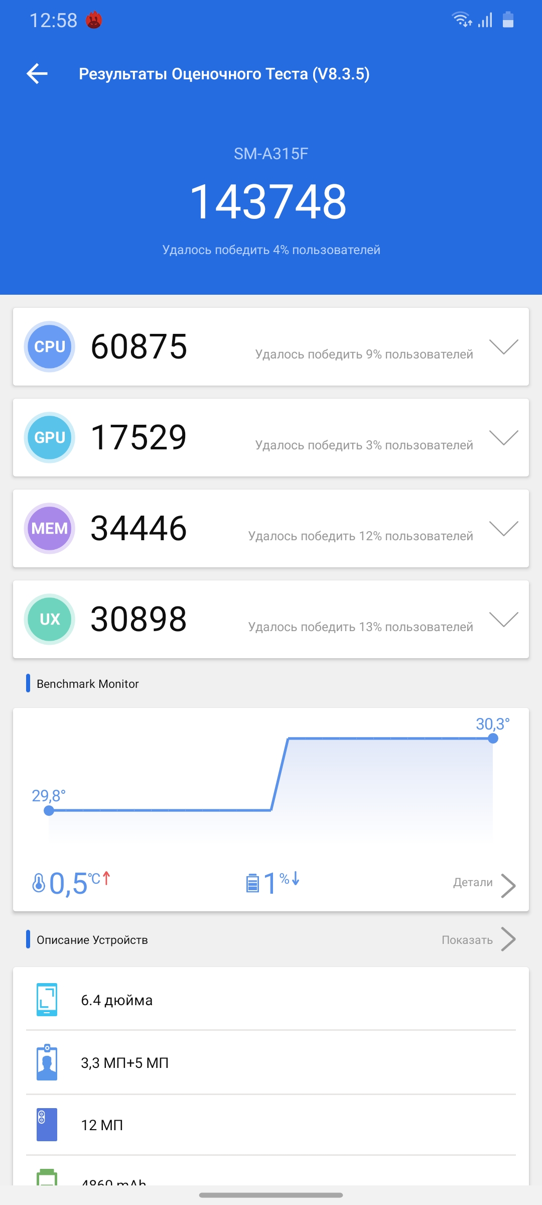 Критических проблем с перегревом у смартфона нет, но и самым холодным его назвать нельзя. В Throttling Test приблизительно после 6 минут производительность падает в среднем до 83% производительности и в таком режиме держится до конца стандартного 15-минутного теста. Корпус при этом становится слегка тёплым.