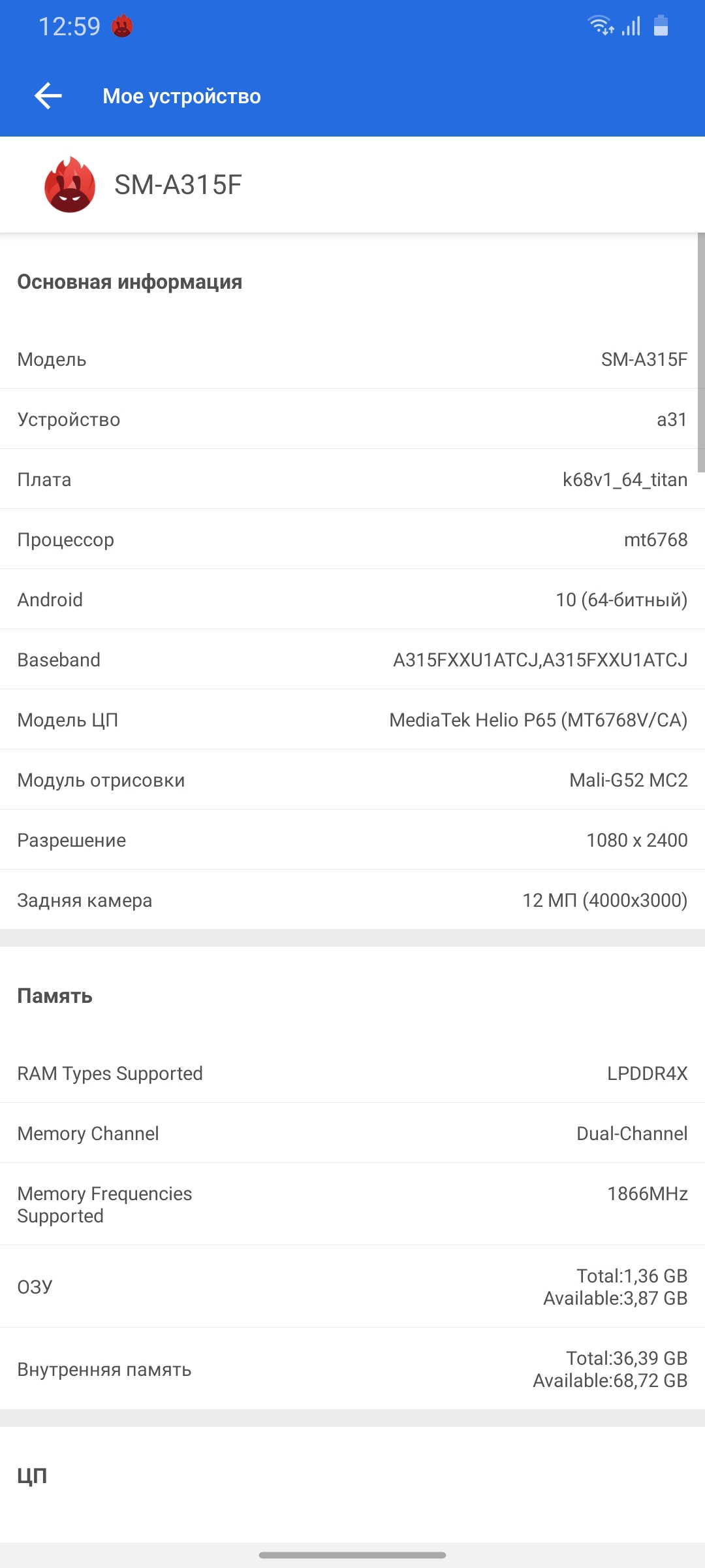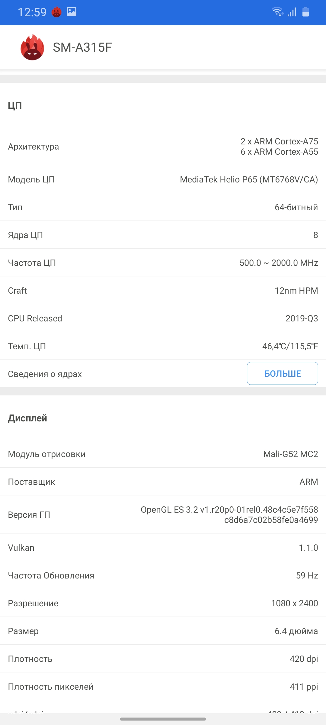 | Процессор | 64-битный восьмиядерный MediaTek Helio P65 (12 нм): 2x2.0 ГГц Cortex-A75 + 6x1.7 ГГц Cortex-A55, GPU Mali-G52 MC2 |