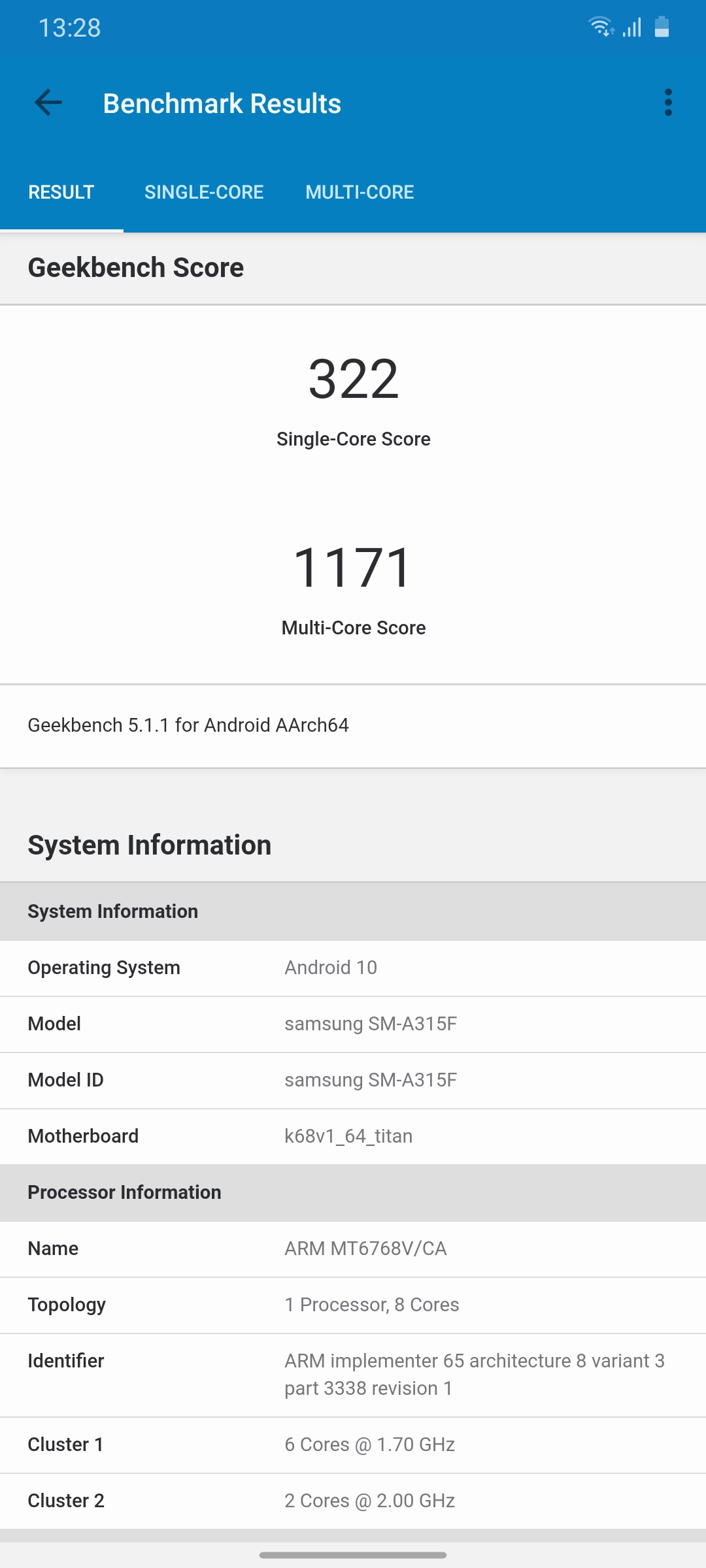 Большинство своих смартфонов Samsung оснащает собственными процессорами Exynos. В частности и предшественник, Galaxy A30 работал на Exynos 7904. В Galaxy A31 решили использовать платформу MediaTek Helio P65, которая как раз и ориентирована на использование в недорогих смартфонах. Процессор производится по 12-нм техпроцессу, включает в себя два ядра ARM Cortex-A75 с частотой 2 ГГц, шесть ядер ARM Cortex-A55 1.7 ГГц и графический ускоритель Mali-G52 2EEMC2 с частотой до 820 МГц. Оперативной памяти может быть 4 или 6 ГБ ОЗУ, встроенной — 64 или 128 ГБ. Старшей версии с 6 ГБ ОЗУ у нас пока в продаже нет. Samsung Galaxy A31 демонстрирует вполне ожидаемые невысокие результаты в бенчмарках, которые в целом соответствуют классу смартфона.