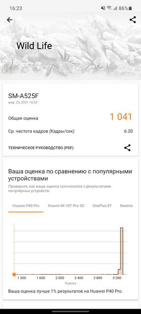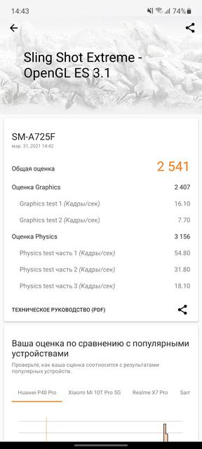 Samsung Galaxy A72 и Galaxy A52 оснащены аккумуляторами на 5000 мАч и 4500 мАч соответственно. Оба смартфона поддерживают быструю проводную зарядку 25 Вт, Samsung обещает, что с её помощью младшая модель (с 4500 мАч) будет заряжаться до 50% за полчаса. Проверить это, к сожалению, не было возможности: к нам смартфоны приехали без комплектов. Да и в комплекте будет зарядное устройство на 15 Вт. Да, хотелось бы 25 Вт, но у флагманов и вовсе нет БП в комплекте. Смартфоны использовались исключительно в режиме экрана 90 Гц. При активном использовании, ни в чём себе не отказывая (разговоры, фото, игры, социальные сети, почта, YouTube, веб-серфинг) обычно к позднему вечеру оставалось 35-40%, так что полтора дня вполне реальны при более умеренном использовании. У Samsung Galaxy A72 аккумулятор побольше, чем у Galaxy A52. Но и экран крупнее, так что разница в автономности не кардинальная. В тесте автономности PC Mark Galaxy A52 показал очень неплохой результат: