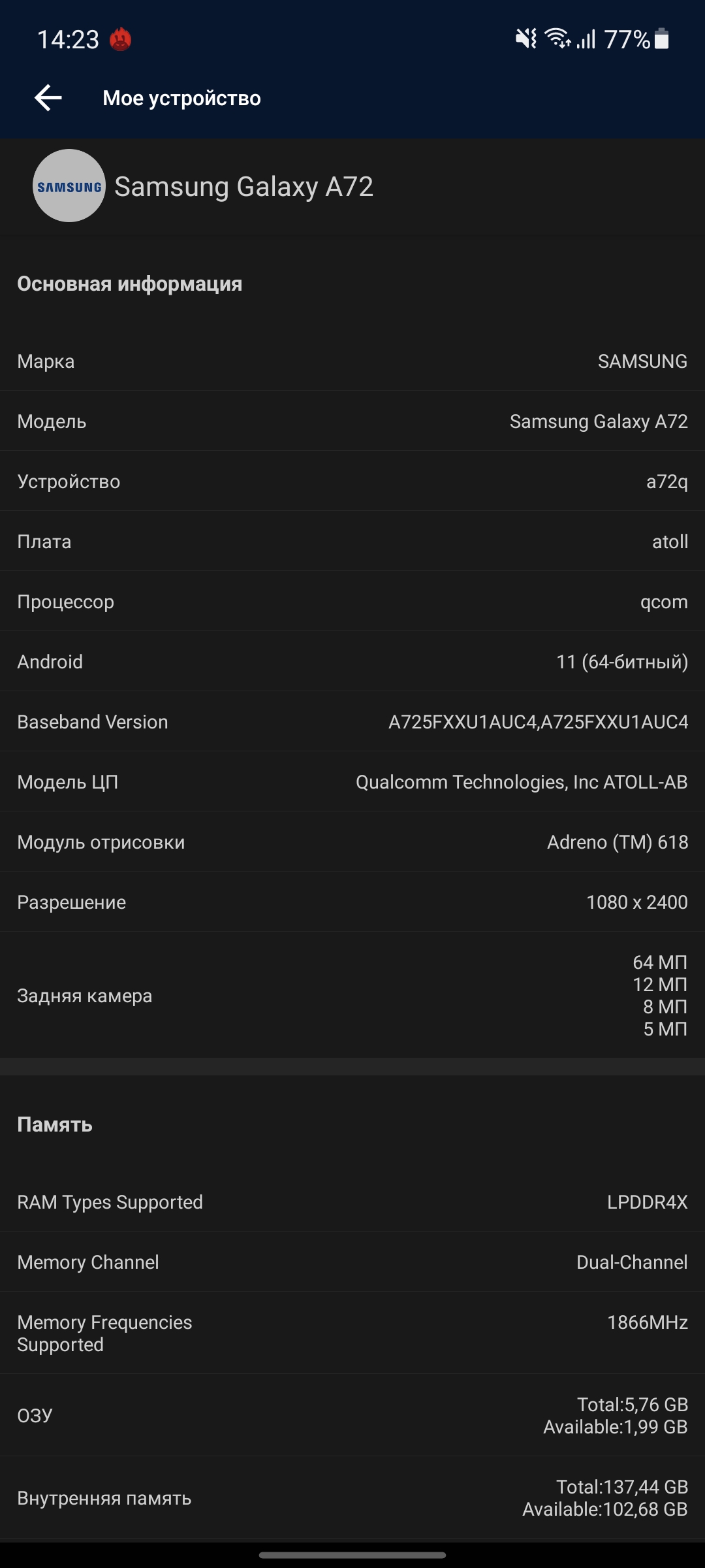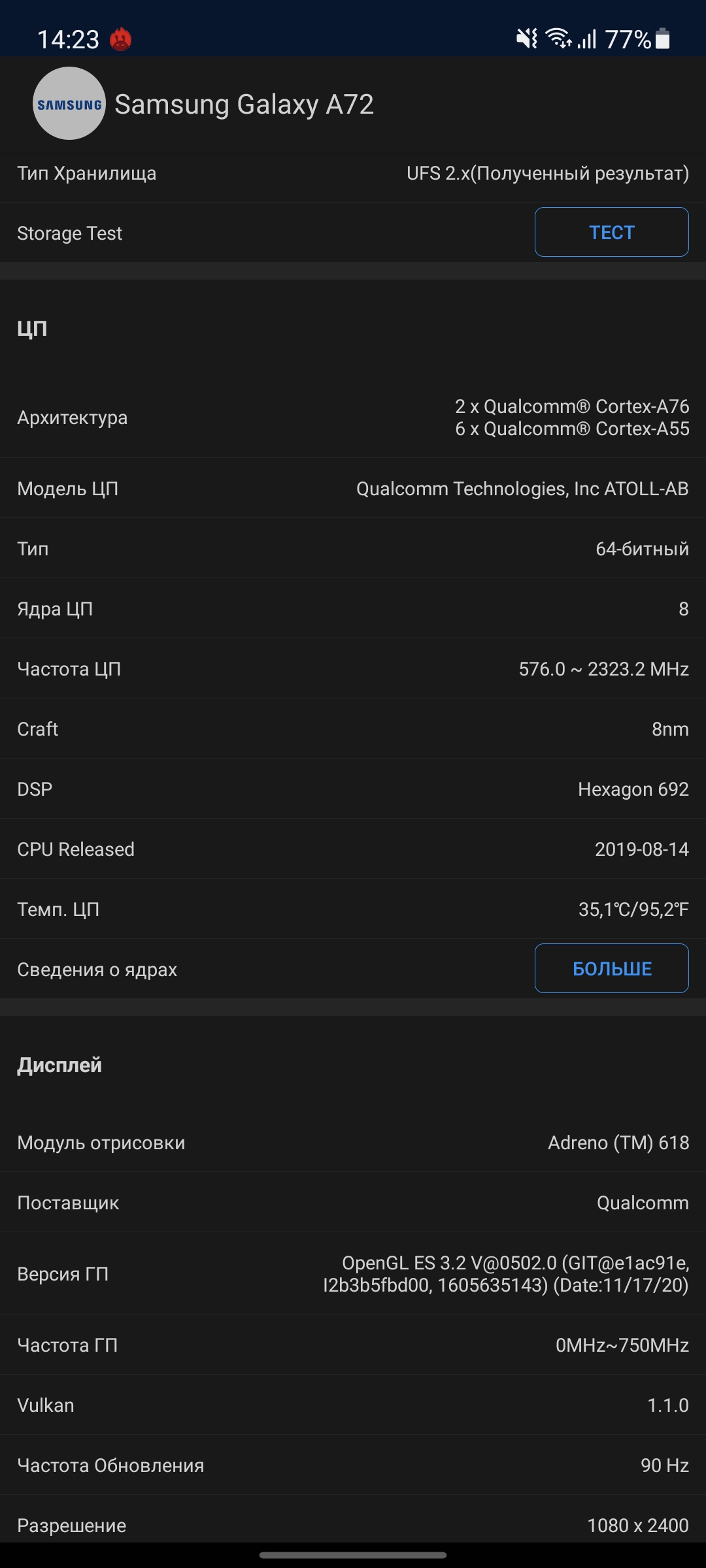 В прошлом поколении Galaxy A51 работал на фирменном процессоре Exynos 9611, а Galaxy A71 — на Snapdragon 730. В этом году решили использовать идентичное "железо". Внутри смартфонов установлен весьма удачный процессор среднего ценового сегмента Qualcomm Snapdragon 720G. Он производится по 8-нм техпроцессу и включает в себя два ядра Kryo 465 Gold по 2.3 ГГц и шесть Kryo 465 Silver по 1.8 ГГц, за графику отвечает ускоритель Adreno 618. Оперативной памяти — может быть 6 или 8 ГБ LPDDR4x (младший Galaxy A52 также доступен в версии с 4 ГБ), а объём накопителя может быть 128 или 256 ГБ UFS 2.1. Результаты Samsung Galaxy A72 в синтетических тестах.