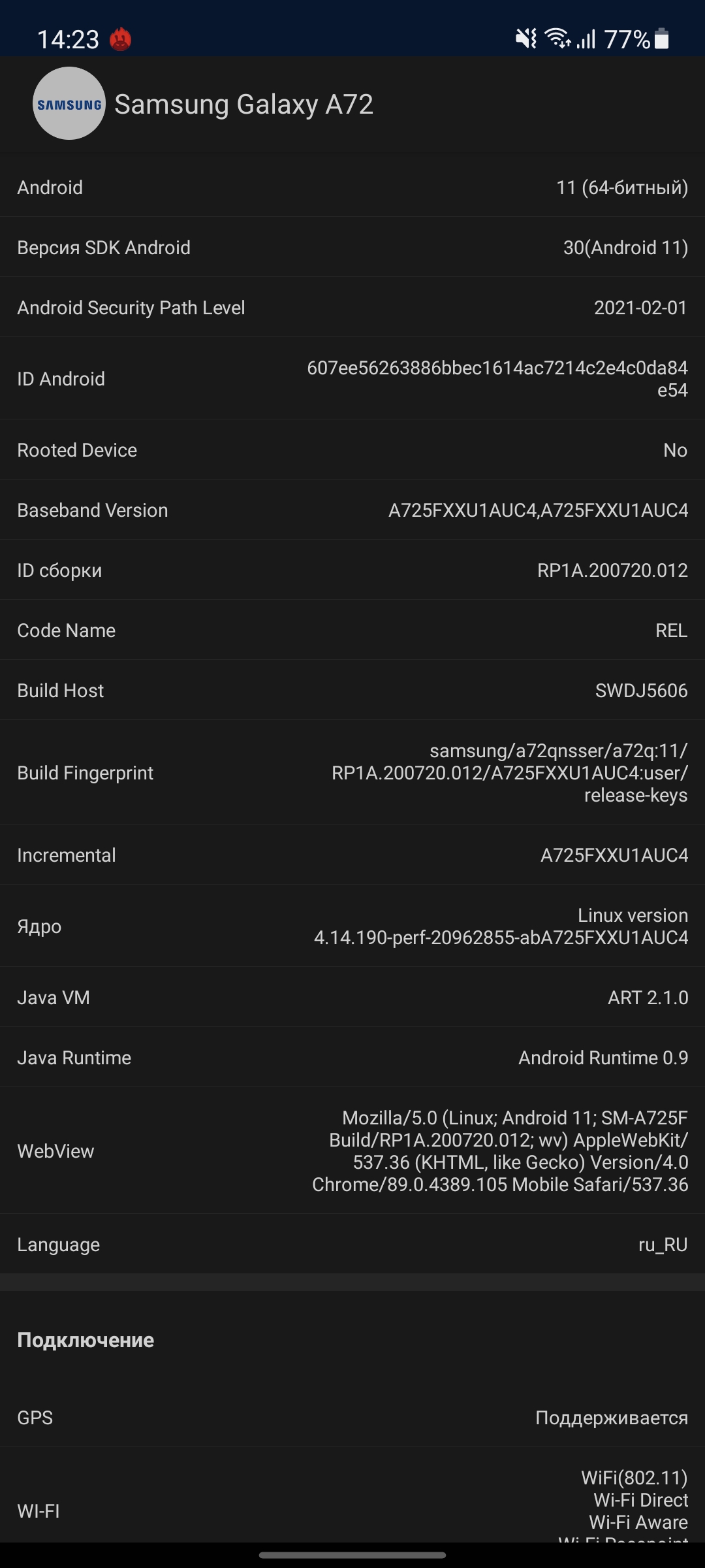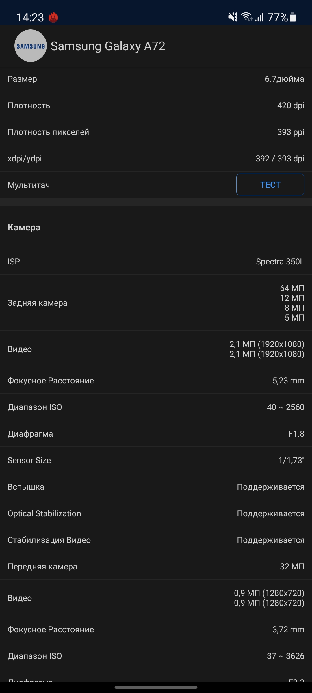 Экраны хорошего качества, с типичными особенностями AMOLED: "настоящий" чёрный, высокая контрастность и очень яркие цвета в "насыщенном" режиме. В "естественном" цветопередача больше напоминает IPS-матрицы. Углы обзора максимальные, зеленоватый оттенок на белом (стандартная фишка AMOLED) практически не проявляется. Samsung Galaxy A72 в "Насыщенном" режиме с ручной регулировкой демонстрирует максимальную яркость 414.808 кд/м2. При этом цветовой охват значительно шире sRGB, картинка немного уходит в холодные оттенки.