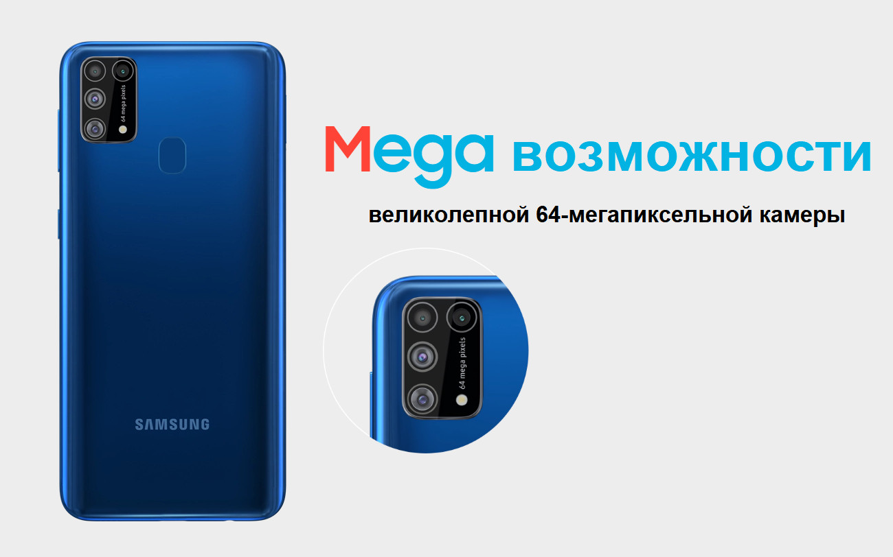 Главные преимущества Samsung Galaxy M31 — это 6,4-дюймовый SAMOLED дисплей, 6/128 ГБ памяти, квадро-камера на 64 Мп и аккумулятор емкостью 6000 мАч.