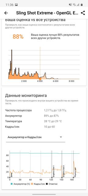Смартфон работает вполне стабильно при длительных пиковых нагрузках, заметное проседание производительности наблюдается только спустя 10 минут Throttling Test, при этом она падает до 86%, что не критично.