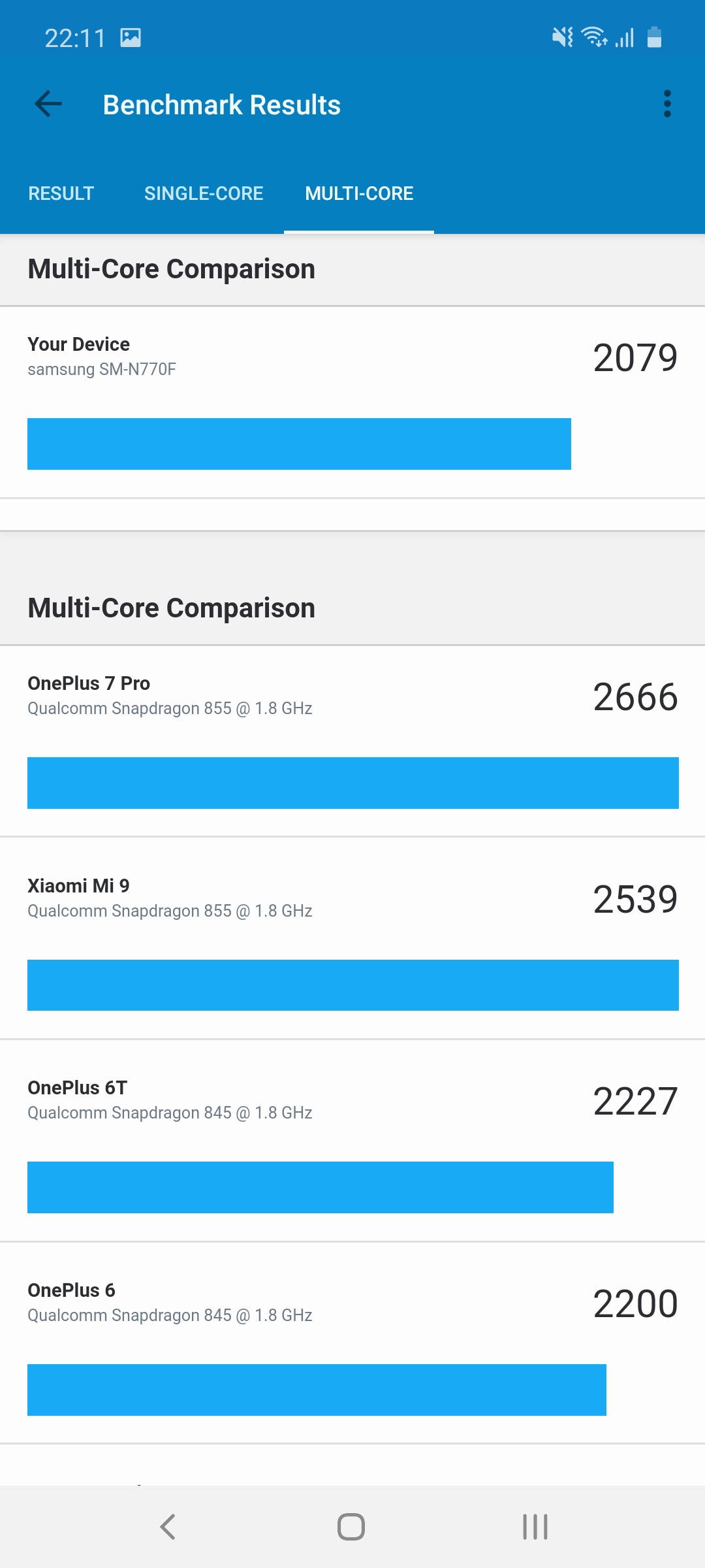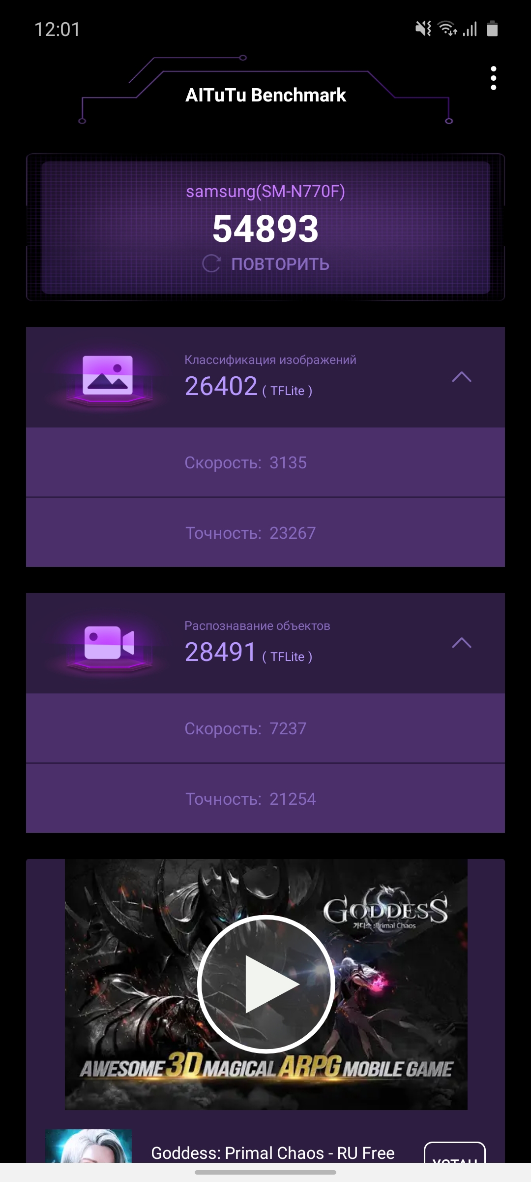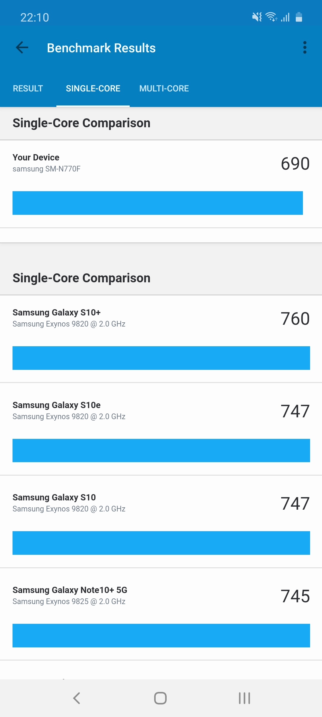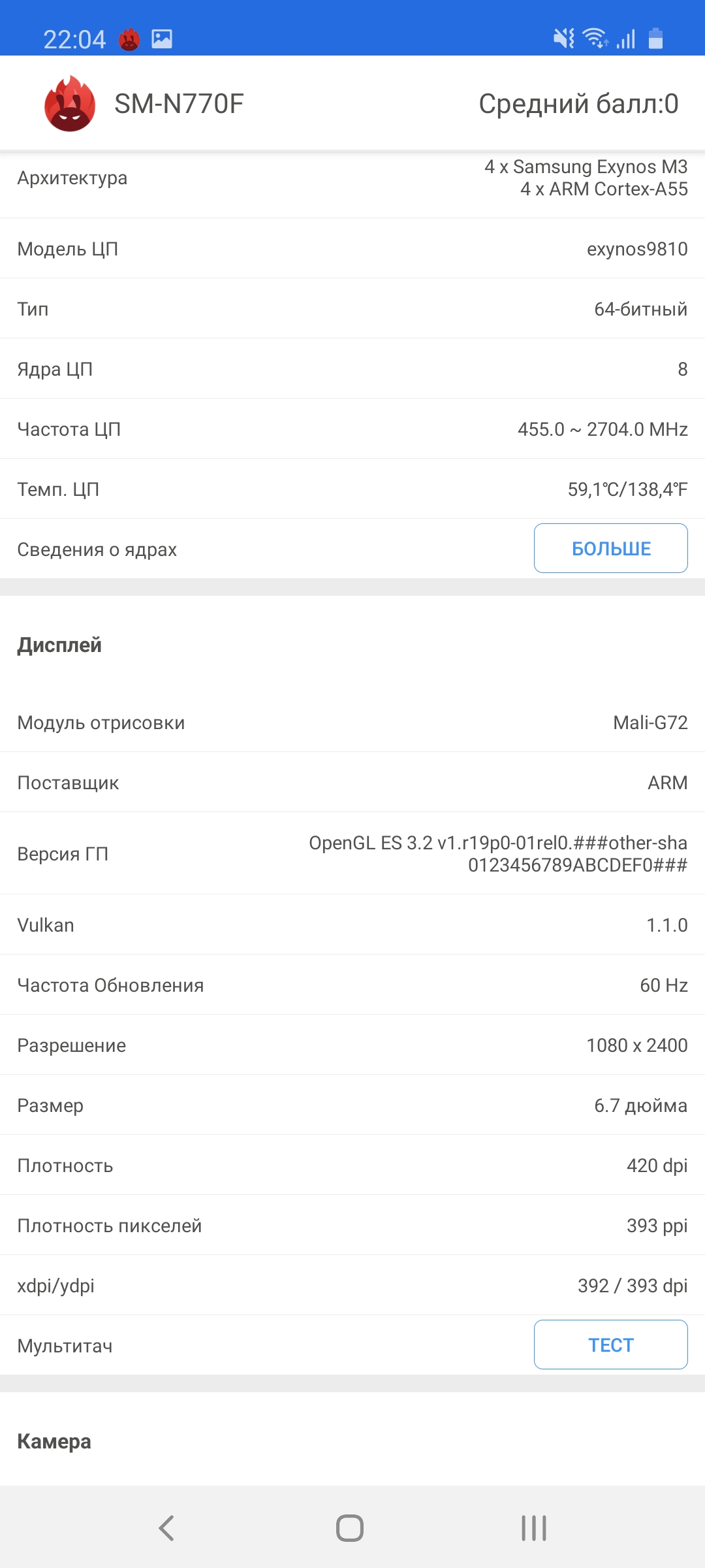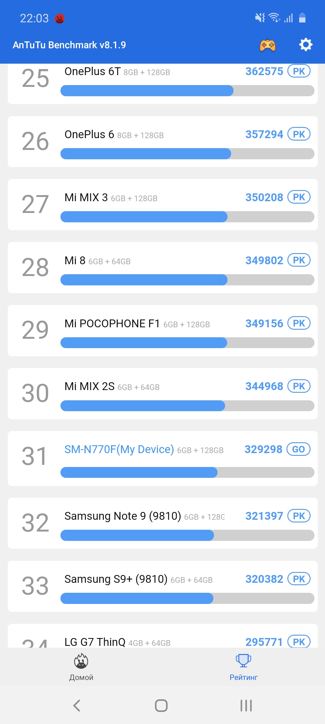 Если говорить в общих чертах, то смартфон получил флагмаские компоненты предыдущего поколения: процессор тот же, что использовался в Samsung Galaxy S9/S9+ и Note9. Это очень даже неплохо, ведь флагманские процессоры обычно не превращаются в "тыкву" спустя год и их производительности по-прежнему хватает. Если более детально: в смартфоне установлен 10-нанометровый процессор Samsung Exynos 9810 с четырьмя производительными ядрами 2.7 ГГц Mongoose M3, четырьмя энергоэффективными 1.8 ГГц Cortex-A55 и графическим ускорителем Mali-G72 MP18. Оперативной памяти — 6 ГБ. Да, в тестах производительности смартфон несколько уступает актуальным флагманам, но в реальных задачах никаких претензий к производительности нет: