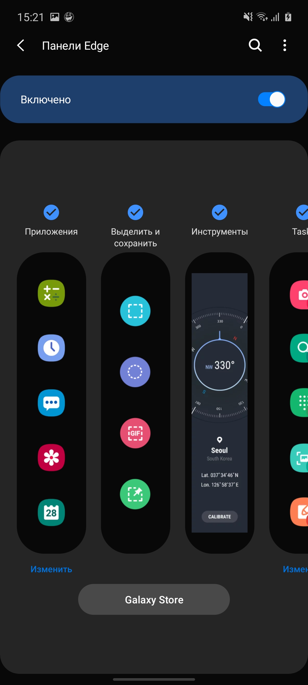 Интересно, что несмотря на отсутствие изогнутых боков у дисплея, в смартфоне осталась панель Edge. Более того, в настройках она находится в пункте "Изогнутый экран". Но, в целом, функциональность уже хорошо знакома. Это — набор быстрых инструментов, которые вызываются движением от края экрана в месте, где расположена соответствующая метка. Панели можно настроить, скачивать и добавлять дополнительные. Есть и всяческие компасы, линейки, фонарики, есть список быстрых контактов, музыкальный плеер, буфер обмена и так далее.