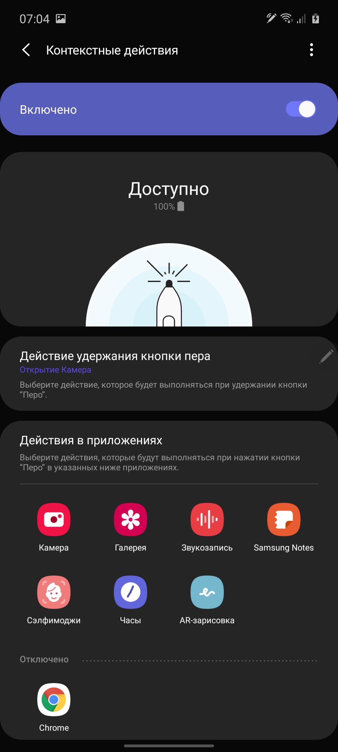 Каких-то нововведений в конструкции S Pen нет: он оснащён единственной механической кнопкой, а внутри есть Bluetooth-модуль и аккумулятор, который заряжается пока стилус в смартфоне: