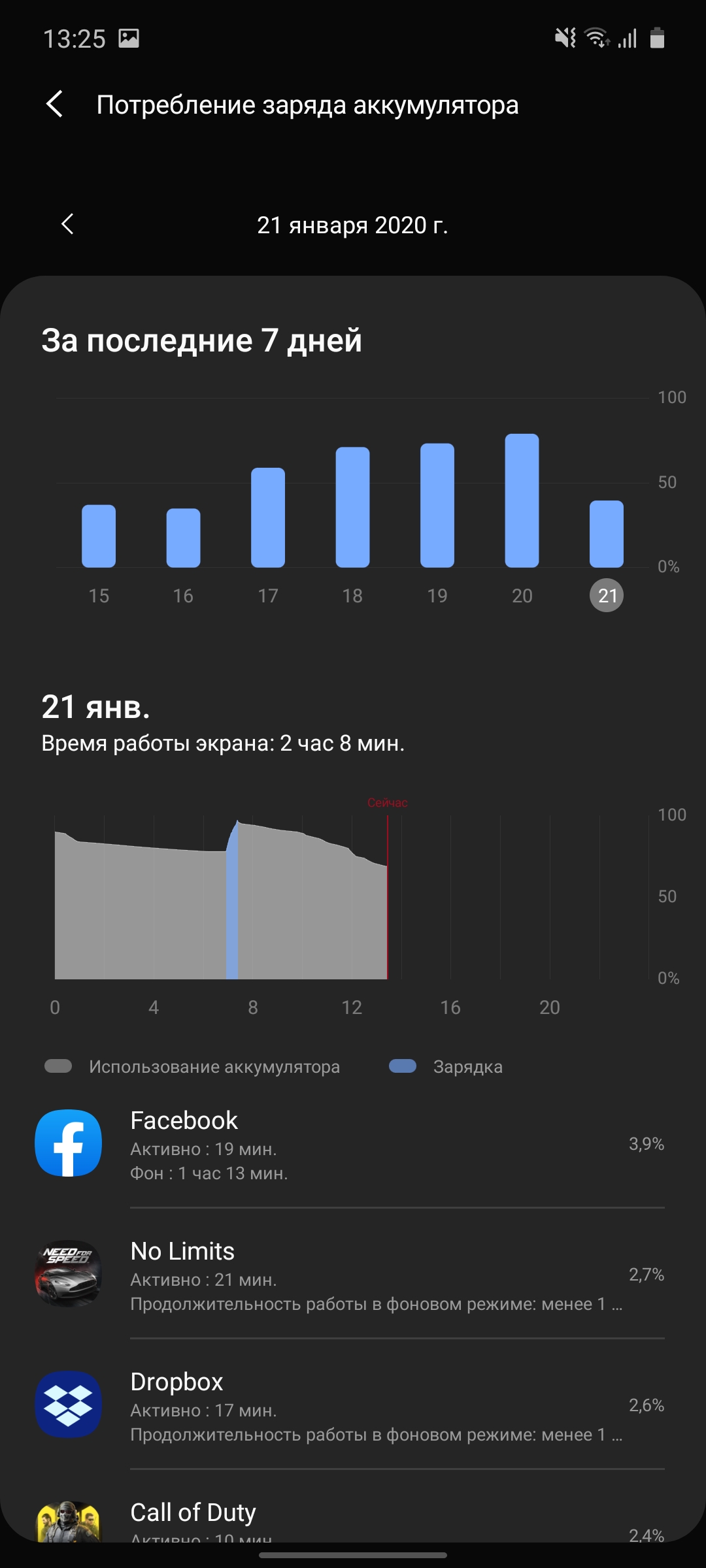 Ёмкость аккумулятора составляет 4500 мАч, что даже немного больше, чем у флагмана Galaxy Note10+. В среднем хватает на полтора дня довольно активного использования, включая немного игр и видео с YouTube, социальные сети, почту, веб-серфинг и немного фотографий. Более активным геймерам хватит на день, а более сдержанные пользователи смогут растянуть и на 2 дня. Предусмотрены разные варианты на тему режимов энергосбережения, а также нечто типа стандартной для Android функции Digital Wellbeing (Цифровой баланс), в Samsung это назвали "Использование устройства и родительский контроль". Предназначена для мониторинга использования смартфона, времени в разных приложениях и ограничения времени при необходимости. В целом, это было и в прошлой версии One UI, но с обновлением функций стало побольше и изменился дизайн.