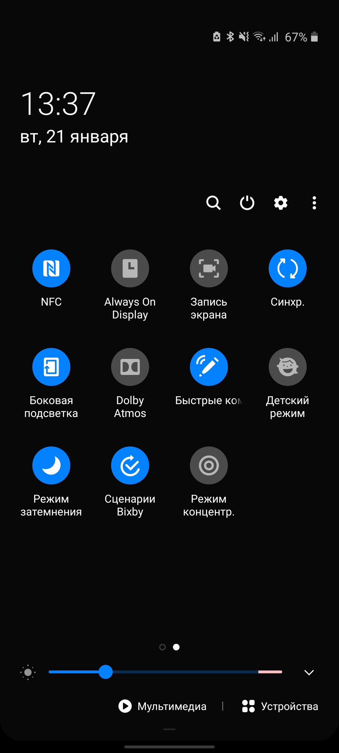 Galaxy Note10 Lite и оснащён Super AMOLED дисплеем с диагональю 6.7 дюймов и разрешением 2400х1080. Чуть меньше, чем у Galaxy Note10+ (6.8 дюйма) и больше, чем у Galaxy Note10 (6.3 дюйма), но пропорции у новинки более вытянутые: 20:9 вместо 19:9. Пиксельная плотность составляет 394 ppi, чуть ниже, чем у Note10 с 401 ppi. В настройках есть стандартный набор: подстройка яркости, выбора размера шрифта, масштаб элементов интерфейса, фильтр синего, тёмная тема интерфейса, Always on Display, краевая подсветка (при получении уведомлений) и два режима отображения цветов: "естественный" и "насыщенный". В последнем есть возможность настройки цветовой температуры. Это всё мы видели и в прошлых моделях Samsung. Что более интересно — теперь есть защита от мерцания (DC Dimming в некоторых смартфонах). Похоже, она появилась вместе с новой версией ПО. Но в настройках её нет: она работает по умолчанию и отключить её нельзя. Хотя и особого смысла её отключать я не вижу.