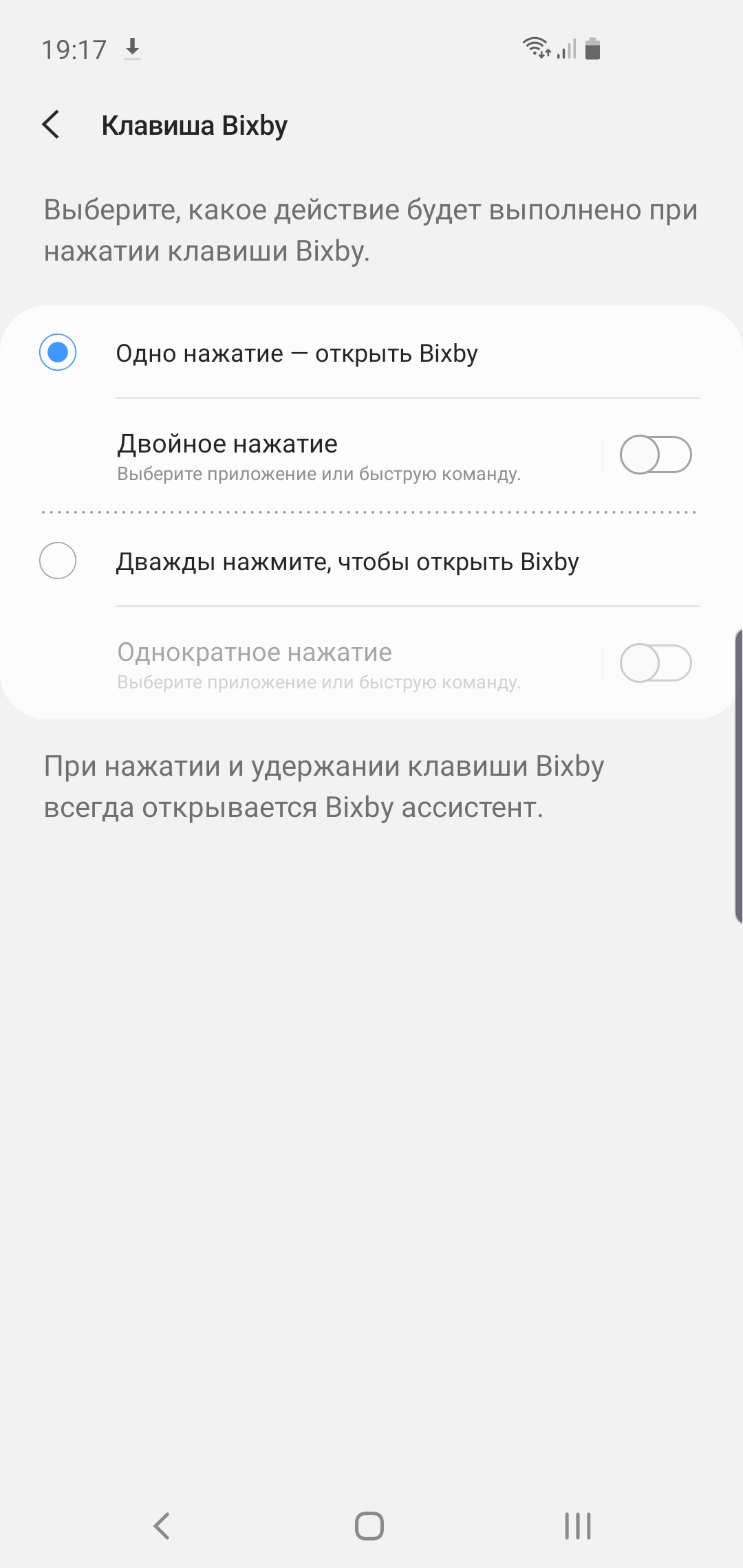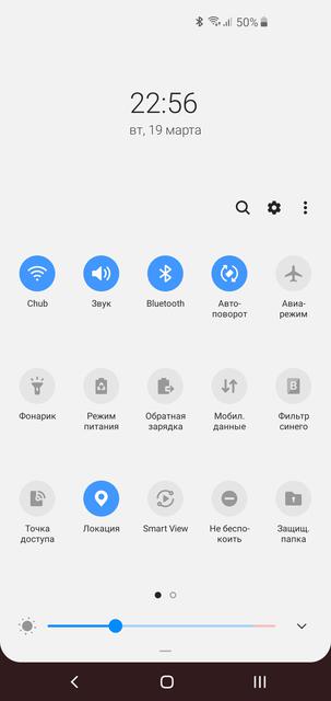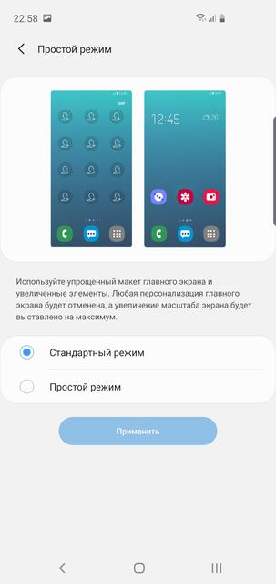 Как и Samsung Galaxy S10+, S10e работает на ОС Android 9 Pie с новой оболочкой One UI версии 1.1. Детально мы её уже разбирали в обзоре S10+. Если кратко, то интерфейс существенно преобразился визуально, в нём появился общий ночной режим, при котором во всех меню и системных приложениях используется чёрный фон. Помимо визуальной разницы, думаю, что ночной режим немного влияет на автономность (учитывая AMOLED, в котором чёрные пиксели не горят). Во многих меню элементы смещаются к середине дисплея для удобной работы одной рукой. Основная же логика оболочки не изменилась: рабочие столы и меню приложений, плюс доступны варианты только с рабочими столами и упрощённый режим с большими иконками: