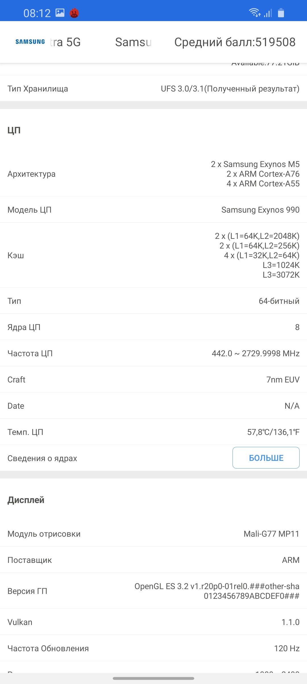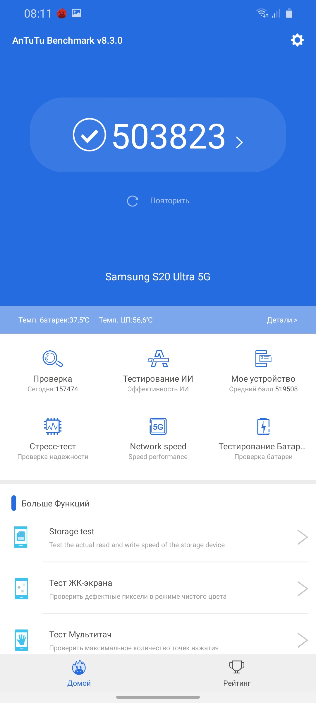Как показал CPU Throttling Test, новая платформа Exynos 990 немного перегревается при длительных пиковых нагрузках и производительность снижается до 83%. В реальности же так нагрузить процессор будет сложновато. Корпус смартфона немного нагревается только при длительном использовании камеры.
