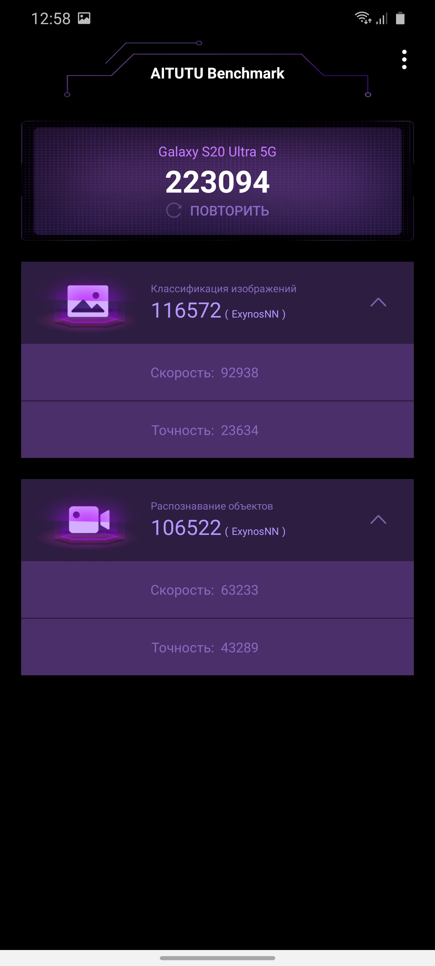 Версия для США (и Гонконга, вероятно) получила чип Qualcomm Snapdragon, глобальная же версия традиционно использует фирменный флагманский процессор, в данном случае это новый Samsung Exynos 990. Он производится по 7-нанометровому техпроцессу EUV (фотолитография в глубоком ультрафиолете). Первым процессором, который производился по данной технологии был Exynos 9825, который используется во флагманах Samsung Galaxy Note10+ и Galaxy Note10. Exynos 990 включает в себя блок из двух кастомных высокопроизводительных ядер Mongoose M5 по 2.73 ГГц, два ядра Cortex-A76 по 2.5 ГГц и четыре энергоэффективных Cortex-A55 по 2 ГГц. За графику отвечает ускоритель Mali-G77 MP11, а за операции с машинным обучением отвечает двойной нейропроцессор. Оперативной памяти 12 ГБ, встроенной — 128 ГБ, используется быстрая память UFS 3.0. Варианты с более вместительным накопителем у нас не продаются (во всяком случае пока). Память можно расширить с помощью карты MicroSD, которая устанавливается вместо второй SIM-карты. Производительность смартфона, разумеется, находится на флагманском уровне. Разумеется, никаких проблем с работой интерфейса и каких-либо приложений в любых количествах нет. В бенчмарках результаты также очень высокие, хотя и не максимальные. Топовый Snapdragon 865 демонстрирует более высокие результаты.