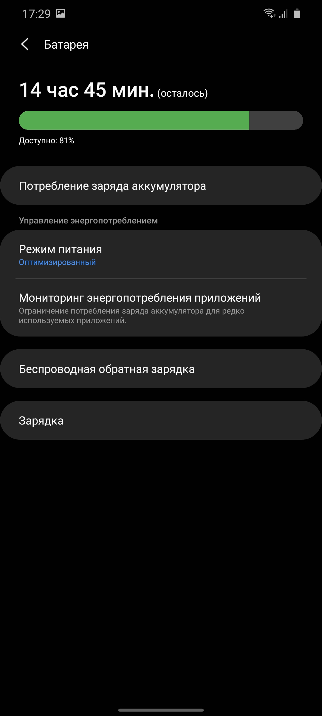 В комплекте ЗУ на 25 Вт, с помощью которого смартфон заряжается за полтора часа. Также поддерживается ещё более быстрый вариант на 45 Вт, но соответствующее ЗУ придётся покупать отдельно. Беспроводная зарядка — до 15 Вт, а также есть функция обратной беспроводной зарядки мощностью 9 Вт.