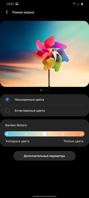 Есть два режима отображения цветов: "насыщенный" с ручной регулировкой цветопередачи и "Естественный". Естественный по цветовому охвату ближе к sRGB, Насыщенный — с расширенным, типичным для AMOLED цветовым охватом, более яркими цветами.