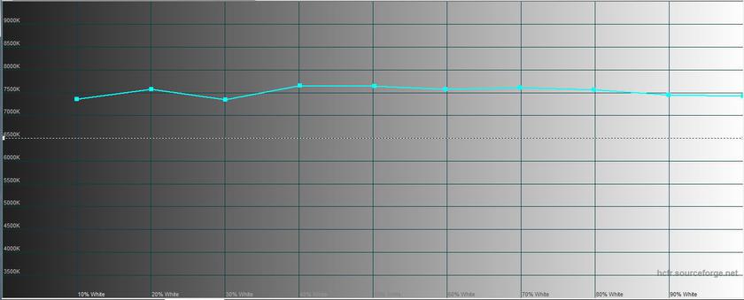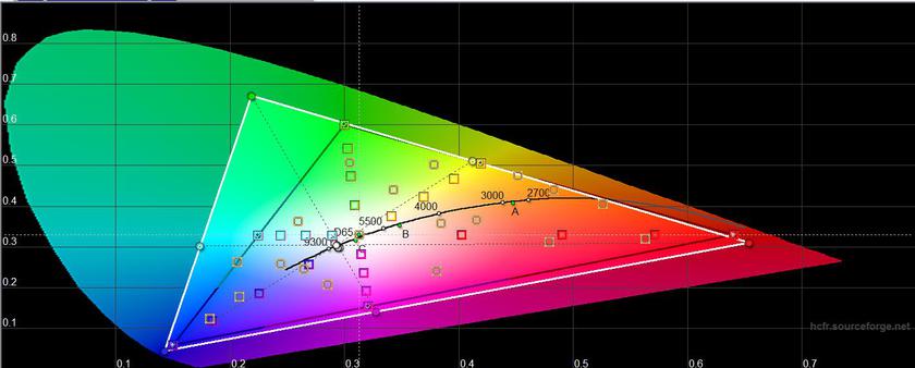 В помещении в "насыщенном" режиме при ручной настройке, максимальная яркость составила 408.388 кд/м2. Хотя в автоматическом режиме при ярком освещении экран выдаёт яркость значительно выше. Экран отлично себя чувствует и на ярком солнце. В этом режиме есть небольшой переизбыток синего, а цветовой охват существенно шире sRGB, что типично для AMOLED: