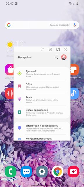 Samsung Galaxy S20 Ultra работает на ОС Android 10 с оболочкой One UI версии 2.1. Компания продолжает совершенствовать свою фирменную оболочку и преимущественно работа нацелена на оптимизацию, а какие-то радикальные изменения происходят не так часто. Сравнительно недавно у нас был на обзоре Galaxy Note10 Lite с One UI 2.0 и текущая версия близка к ней. Изменения преимущественно касаются возможностей новых флагманов, а также мелких доработок. Интерфейс удобный, функциональный и работает быстро. Конечно же, всё оформление собственное, включая иконки, анимации и цветовую палитру. Организация рабочего пространства традиционно в двух вариантах: только рабочие столы, либо они же вместе с отдельным меню приложений. Отдельно есть упрощённый режим с большими иконками. Сетку как рабочего стола, так и меню приложений можно выбирать из разных вариантов. Для удобства управления одной рукой на больших экранах все системные меню при включении смещены в нижнюю часть экрана, а также есть режим уменьшенного окна. При работе с таким гигантом, как Samsung Galaxy S20 Ultra это лишним совсем не будет: