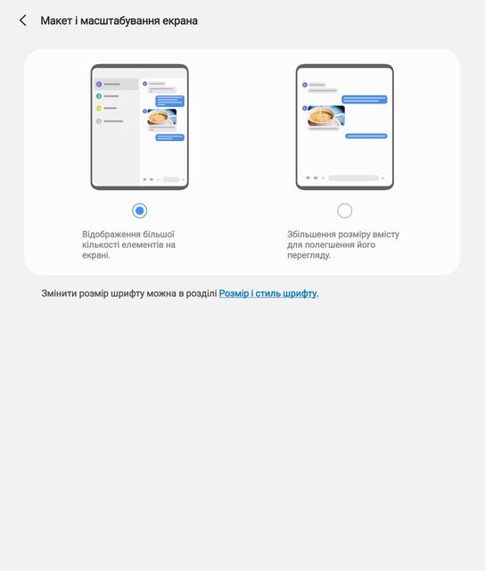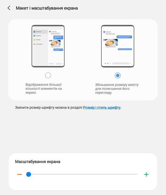 Чуть иначе, чем обычно, выглядит раздел с масштабированием экрана для тех, кому нужно улучшить видимость на экране, и увеличить шрифт. Можно выбрать один из двух вариантов макета приложения. В первом случае экран будет вести себя как планшет (если приложение это умеет), стараясь разместить больше информации на «планшетом» экране. Во втором случае экран ведет себя, как обычный дисплей смартфона и позволяет масштабировать картинку.