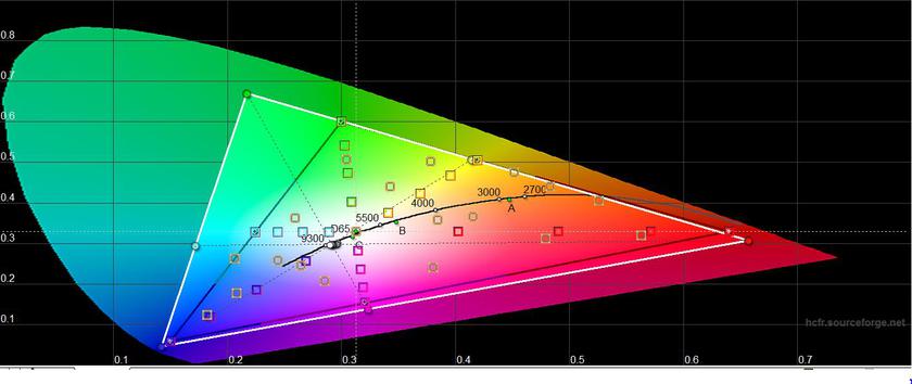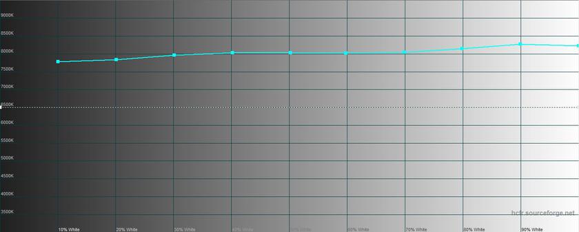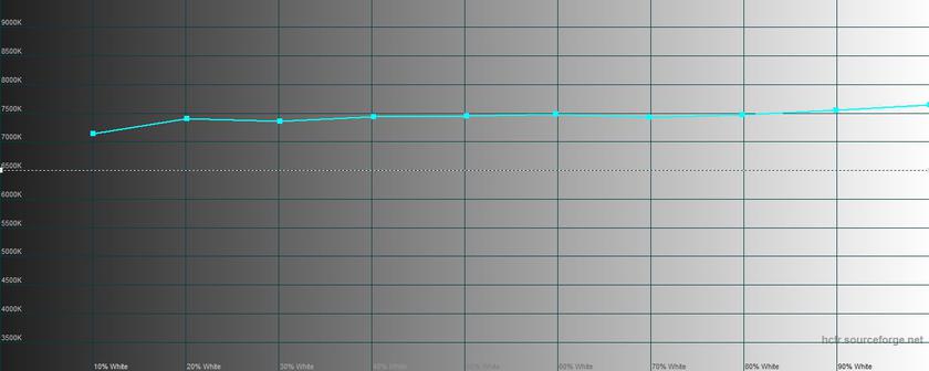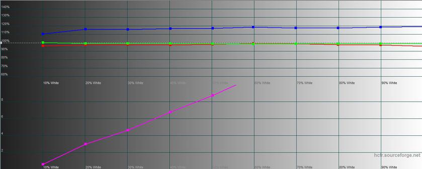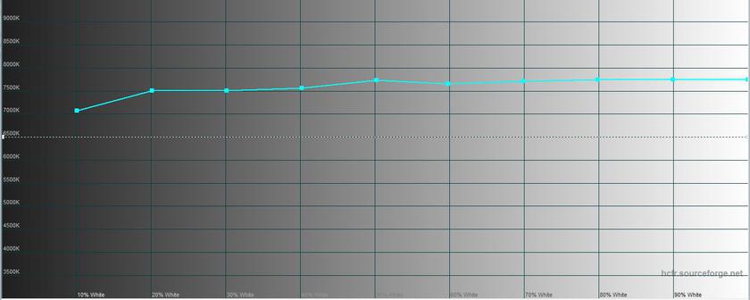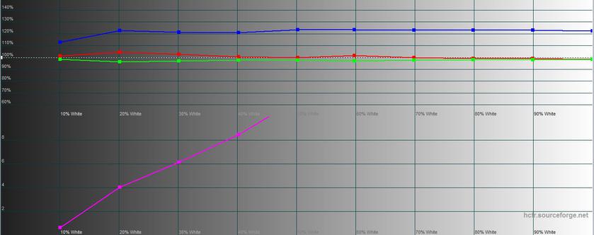 Цветовой охват экрана в этом режиме чуть превышает цветовое пространство sRGB в зеленом цвете, который выглядит ярче, чем хотелось бы. Цветоовая температура стабильно повышенная, но чуть проседает в темных тонах, то есть более светлые участки уходят сильнее в холодную часть спектра. График цветовых составляющих показывает повышенный синий цвет, характерный для всех OLED-экранов.