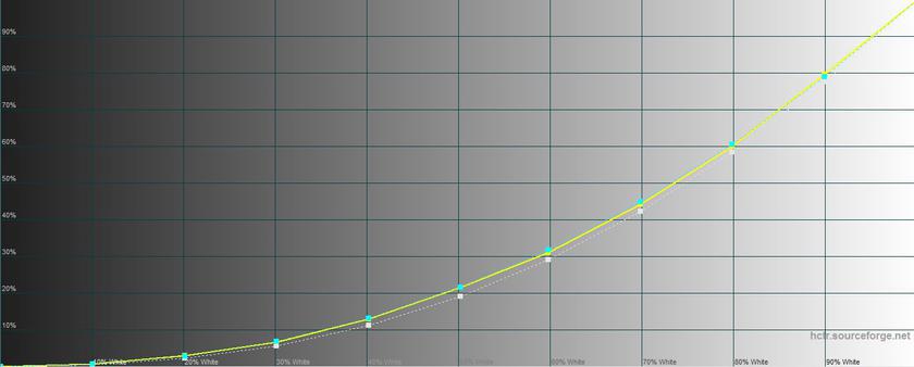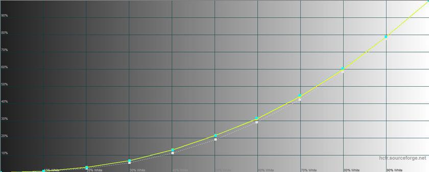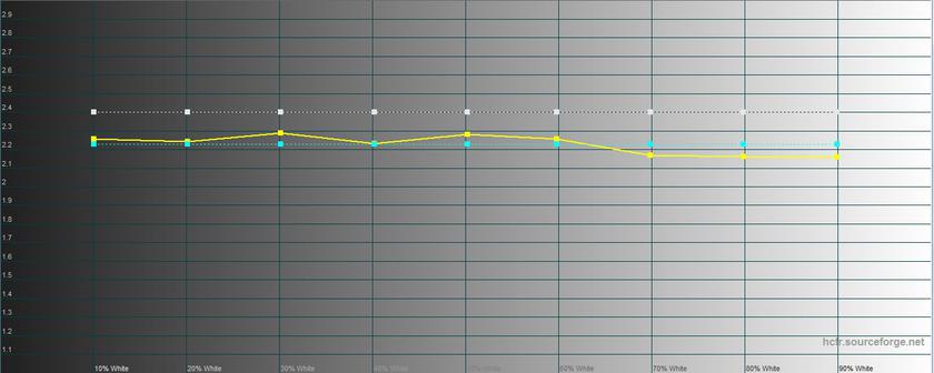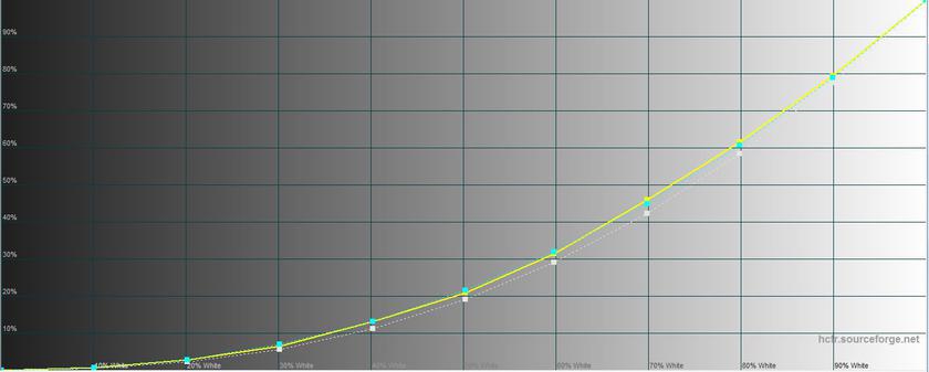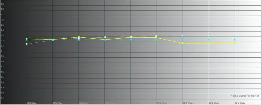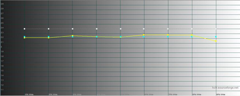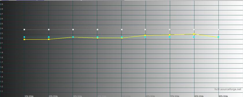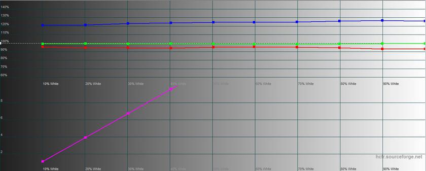 Наконец, последний тест показывает, что цветовой охват основного дисплея в режиме насыщенной цветности превышает цветовой охват sRGB (особенно в синей и зеленой части спектра), а цветовая температура показывает три разных уровня в темных, средних и светлых тонах градиента, то есть страдают светлые цвета изображения, отображающиеся чуть ярче, чем стоило бы. Зато уровень синего повышен не так сильно, как у внешнего дисплея.