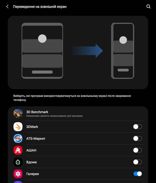 Но есть и настройки, уникальные для Galaxy Z Fold 2. Отдельный пункт меню позволяет включить приложения, которые продолжат свою работу на внешнем экране после закрытия смартфона (и наоборот).