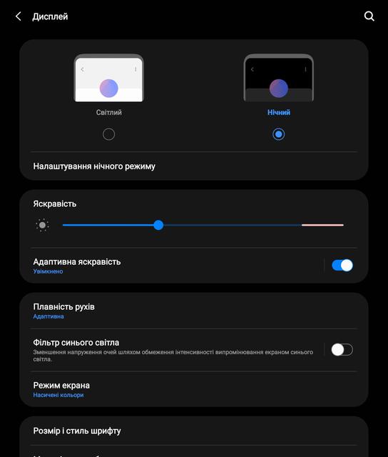 Несмотря на то, что экранов у Galaxy Z Fold 2, оба его дисплея настраиваются одновременно — в настройках нет разделения на внешний и внутренний дисплей. Любые изменения (вплоть до времени отключения неработающего экрана) будут касаться сразу оба экрана. В принципе, большая часть настроек точно такая же, как у любого другого смартфона Samsung с одной из версией AMOLED-экрана. В этом месте напомню, что внешний дисплей — это Super AMOLED с диагональю 6.23", разрешением 2260х816 пикселей и защитным покрытием Gorilla Victus. Внутренний — Dynamic AMOLED 2X со сгибающейся подложкой UTG, о которой я писал в прошлый раз. Она сама по себе прочная и износостойкая, к тому же Corning не изобрела еще защитного покрытия, способного изгибаться, да оно и в меньшей степени необходимо внутреннему экрану, который защищен корпусом в сложенном состоянии. Разрешение внутреннего экрана 2208х1768 пикселей при диагонали 7.6 дюймов.