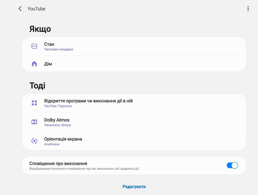 Еще один интересный сценарий: если я нахожусь дома и открываю экран в режиме Flex Mode, автоматически запускается YouTube, причем сразу показывает раздел подписок. Dolby Atmos переключает звук на схему работы «фильм», а ориентация экрана всегда становится альбомной. Конечно, мне не всегда дома нужен только YouTube, этот сценарий скорее приведен для примера.