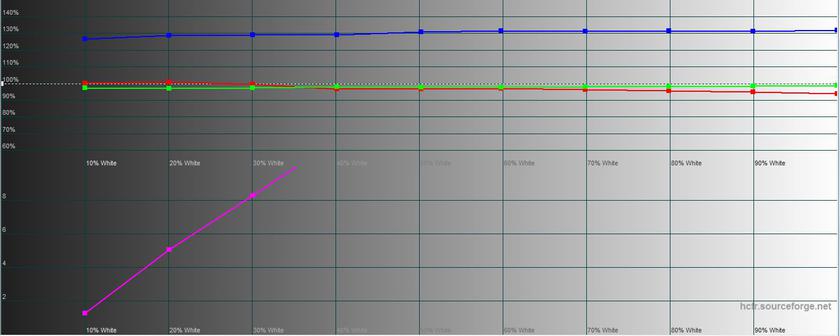 У основного дисплея ситуация, в общих чертах, повторяется. С той лишь разницей, что цветовой охват не дотягивает до цветового пространства sRGB в красном, но так же превышает его, как и внешний дисплей, в зеленом. Цветовая температура уже не так сильно скачет в темных тонах, а яркость синего превышает идеальный показатель за исключением темной части градиента, где она почти в норме.