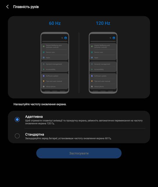 Как и у любого другого AMOLED производства Samsung, у этих экранов есть два основных режима работы — естественные и насыщенные цвета. Понятное дело, по умолчанию стоят насыщенные, которые позволяют полностью раскрыть возможности экранов. Для любителей поковыряться ручками, есть возможность включить фильтр синего цвета (он реально завышен, как нам покажет позже колориметр) или настроить цветовые RGB-каналы по своему усмотрению. В режиме естественных цветов этого управления нет — все отдается «как есть». Как и все новые флагманы Samsung, Fold 2 поддерживает адаптивную частоту обновления экрана (только внутреннего) до 120 герц. Управлять этим процессом вручную нельзя — автоматика сама выбирает что нужно пользователю в данный момент — большая плавность движений или уменьшенное энергопотребление.
