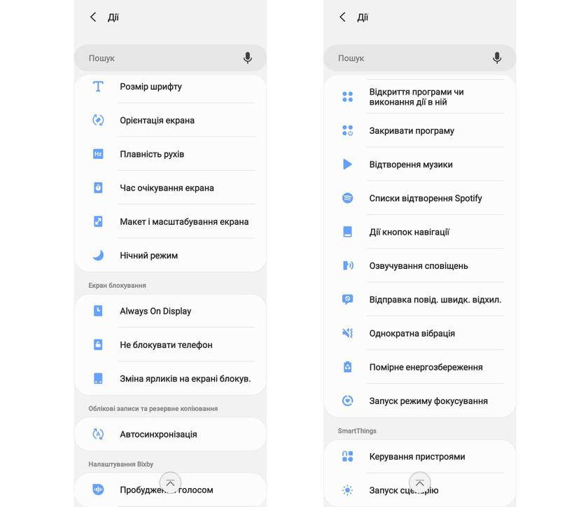 Для тех, кто совсем не знаком со сценариями Bixby в смартфонах Samsung, приведу список доступных настроек. Он состоит из двух частей: списка условий и списка действий при совпадении этих условий.